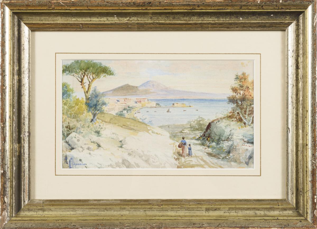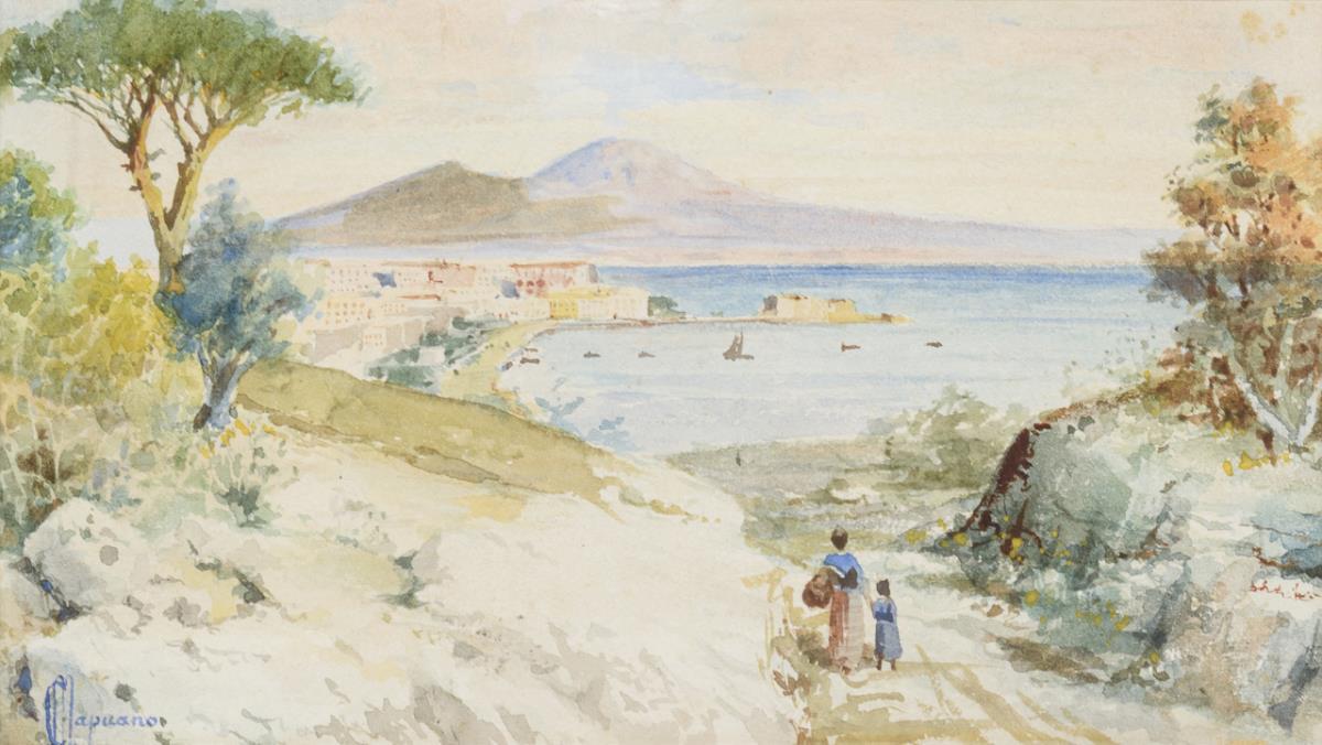 Staffage figures on a path towards the southern Italian city with Vesuvius on the horizon. A small missing part.
