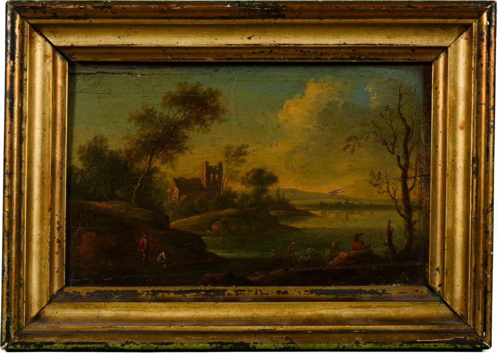 Küstenlandschaft mit Kirche und Staffage. Restaurierungsbedürftig.