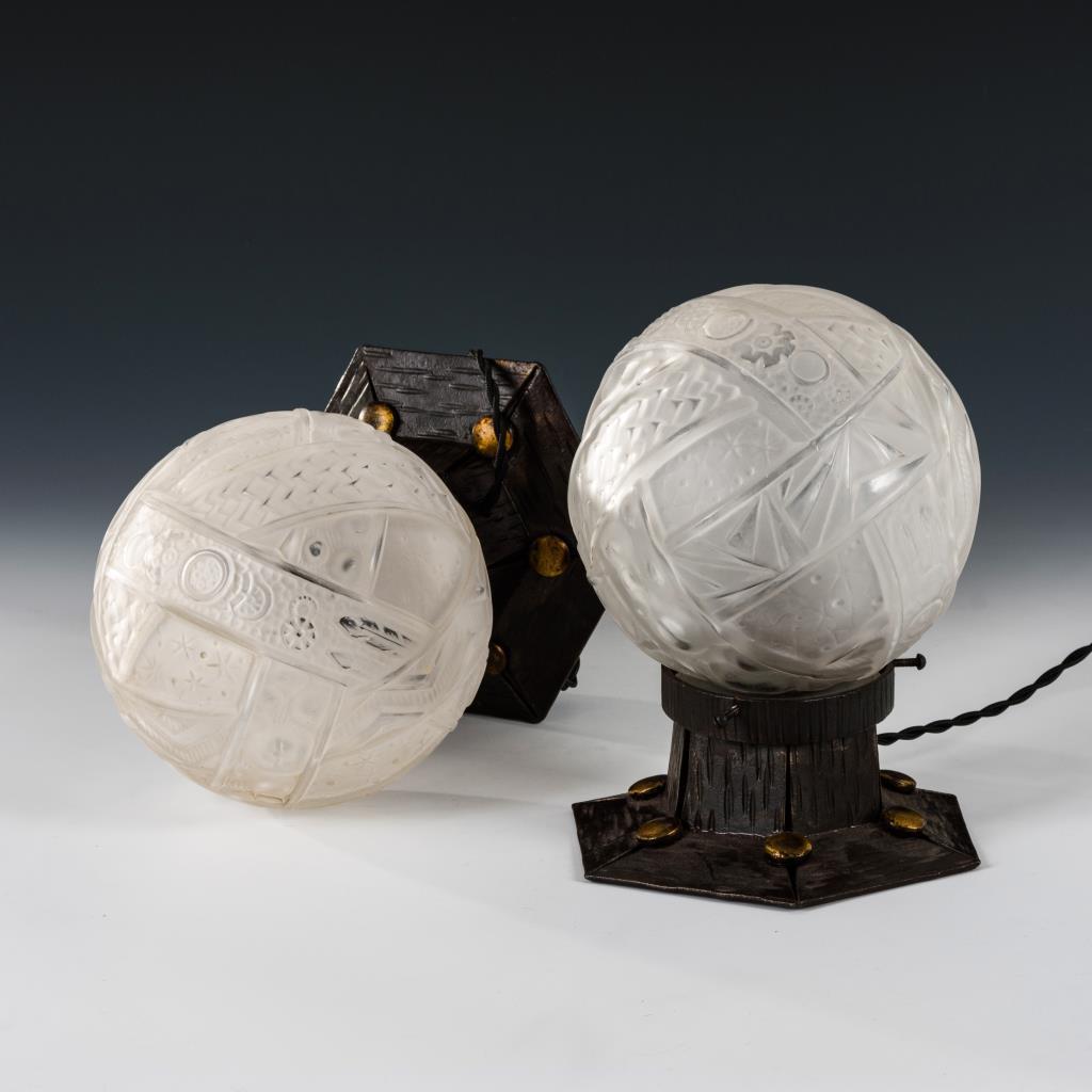 Kugelschirm mit geometrischem und stilisiert floralem Relief. Sechseckiger, schmiedeeiserner Fuß. Elektrifiziert (Funktion nicht geprüft).