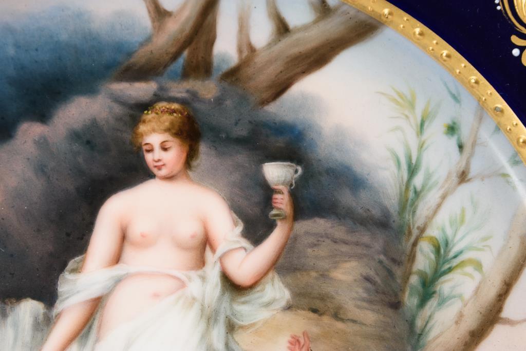 Teller mit Goldrelief- und Juwelenmalerei auf der kobaltblauen Fahne. Im Spiegel die Darstellung einer an einer Quelle stehenden Nymphe mit Pokal sowie zwei Amoretten, unterseitig bezeichnet "Quellennymphe". Goldrand berieben.