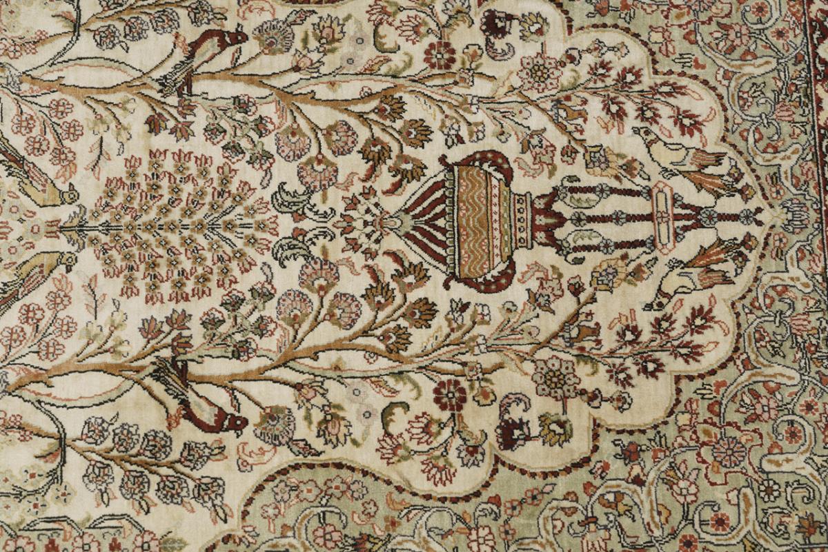 Curved mihrab with flanking columns and hanging oil lamp, a large vase motif with accompanying trees of life and animals in the lower niche. Lush floral decoration with arabesques on an ivory and pastel green ground. Three-row border with rich floral decoration, narrow sides with short kilim finishes and knotted fringes.