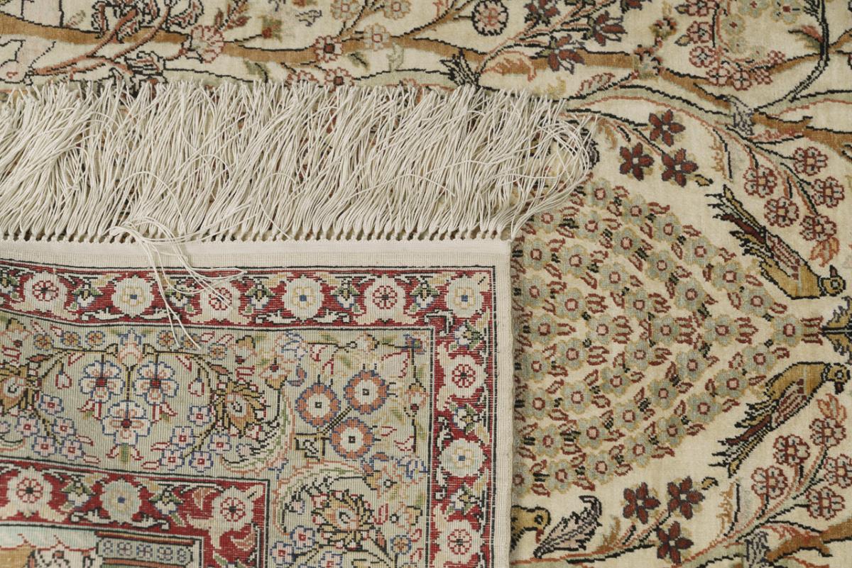 Silk on silk, extremely fine hand-knotting with approx. 1 million knots per sqm. Bright polychrome decoration in predominantly beige and brown tones. Approx. 125 x 77 cm.