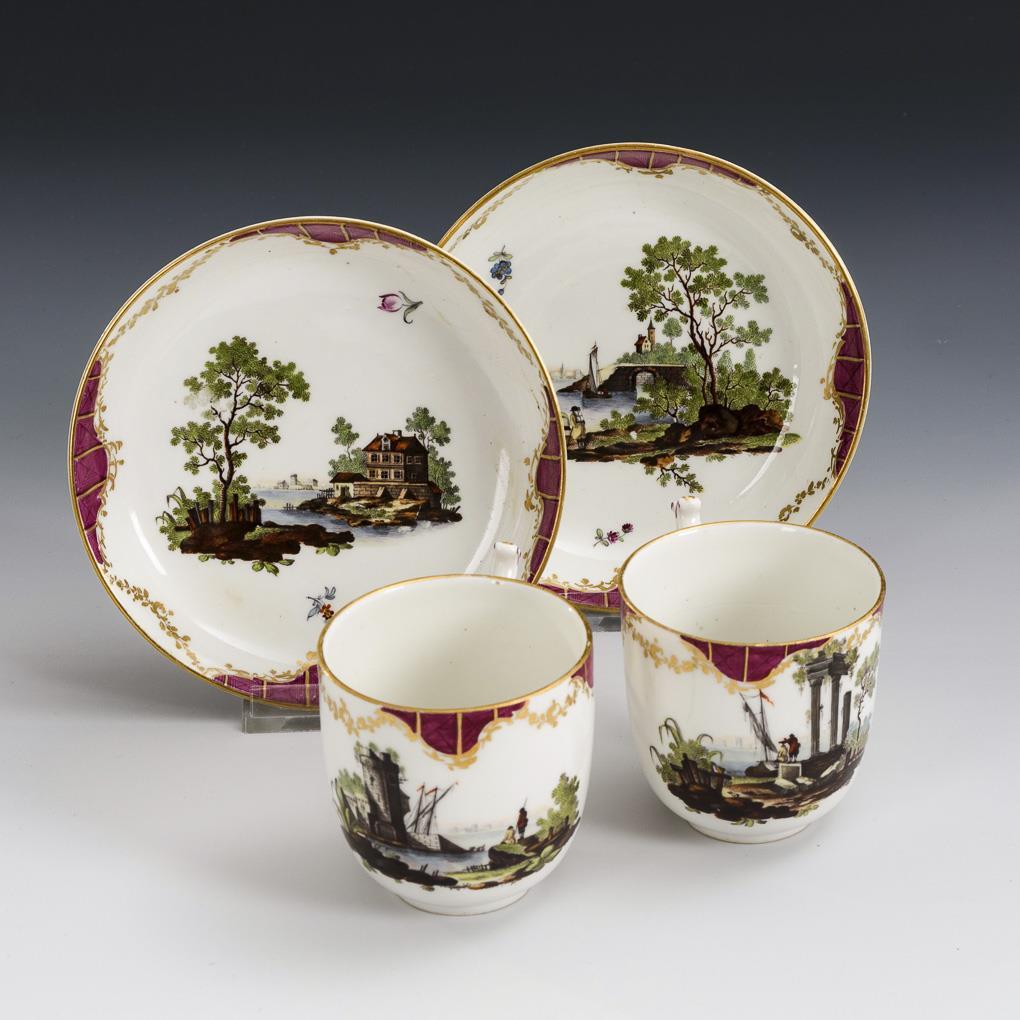 Polychrome painted, gold decorated. H cups 6,5 cm, Ø original saucers 12,5 cm.