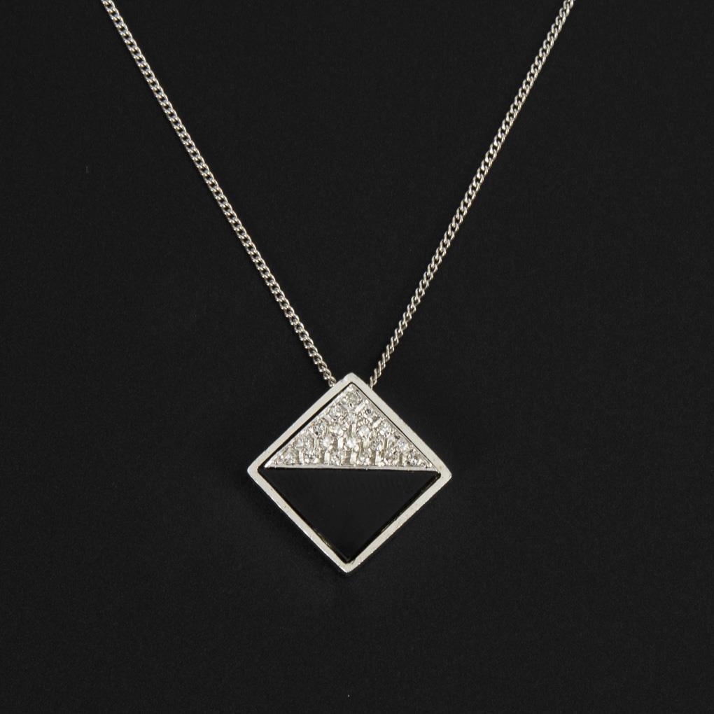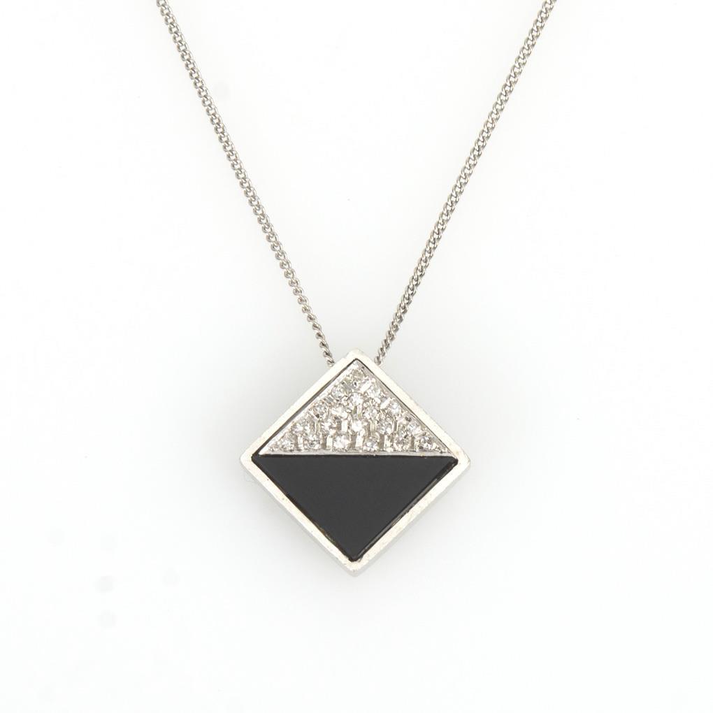 White gold 585 stamped. Diamonds total approx. 0.18 ct. Pendant 1,3 x 1,3 cm. Chain L 38 cm. 4,3 g.