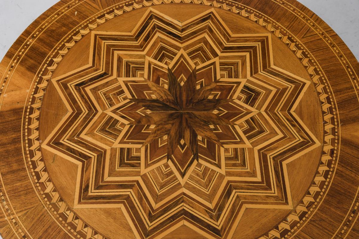 Decorative salon table with finely articulated star marquetry, on partly decorated baluster central support with 3 curved legs, table top numbered "PP 49", labelled "Sigmaringen (Germania)". Restored to living condition, signs of age/use.