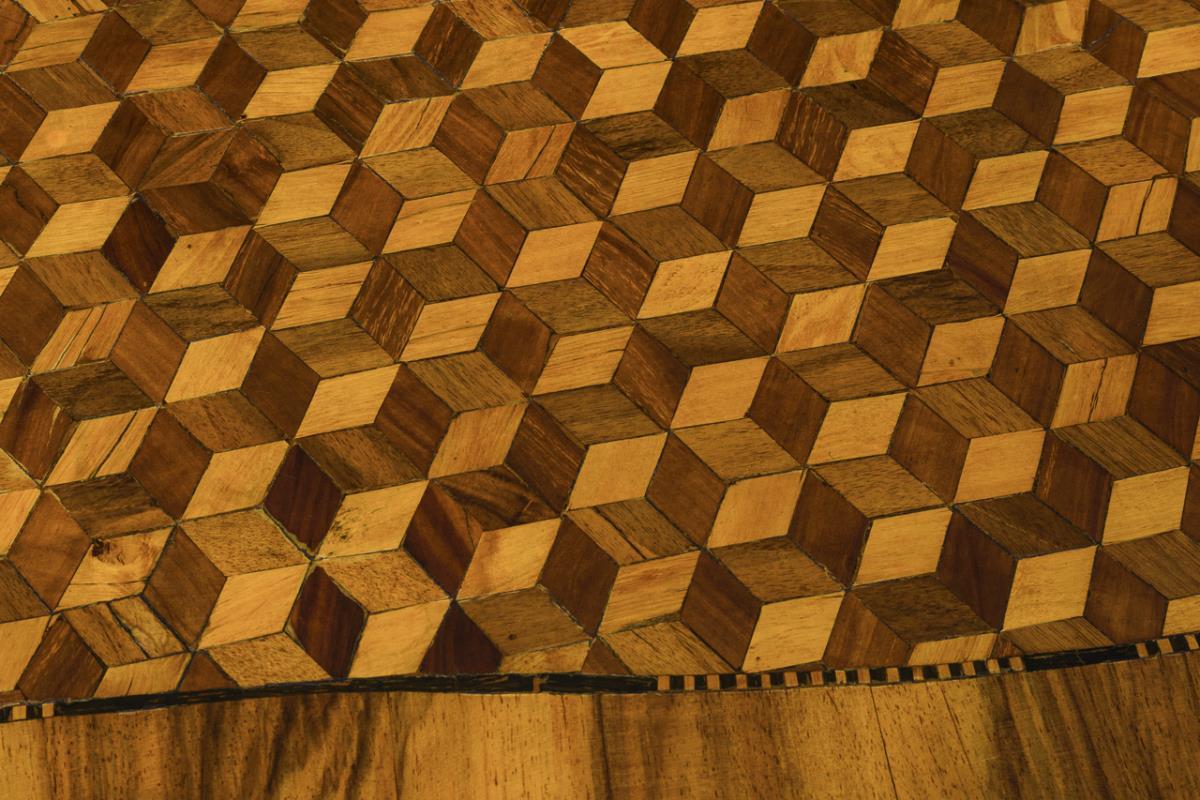 3-bowled, style-typical curved corpus, decorated with cube marquetry, inside lime-green set. Alt restored, 1 lock and brass fittings old supplemented.