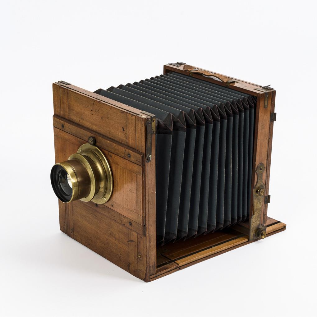 Mahogany, brass, bellows fabric covered with leather corners. Folded 32 x 28 x 9 cm (without lens).