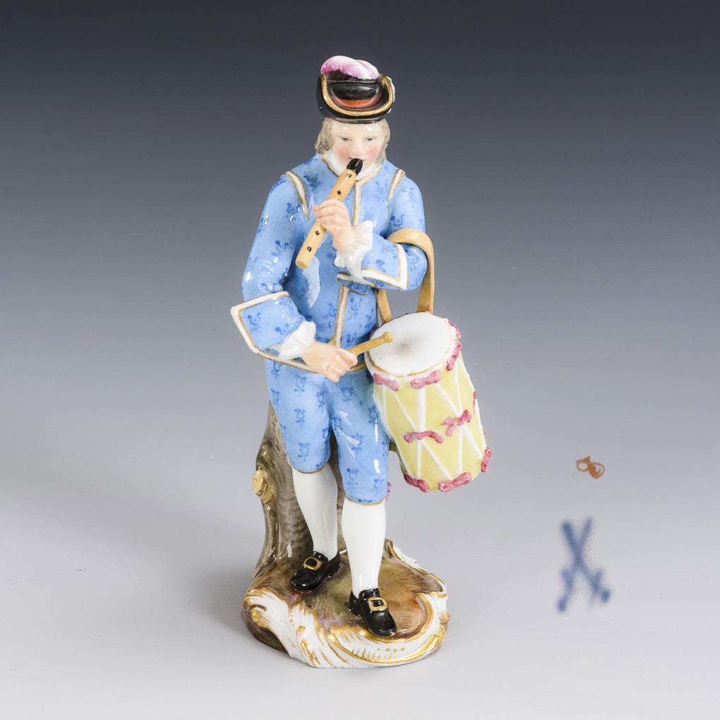 Parisian crier with drum and flute. Small bump on stand, both hands, drum band, drumstick, flute and hat restored.