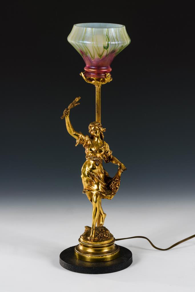 Kraterschirm mit eingezogenem Rand. Auf Stabschaft und Rundfuß mit der Figur einer jungen Frau mit Ähren und Blüten. Beschwerter Fuß. Elektrifiziert (Funktion nicht geprüft). Schirmrand minimal bestoßen.