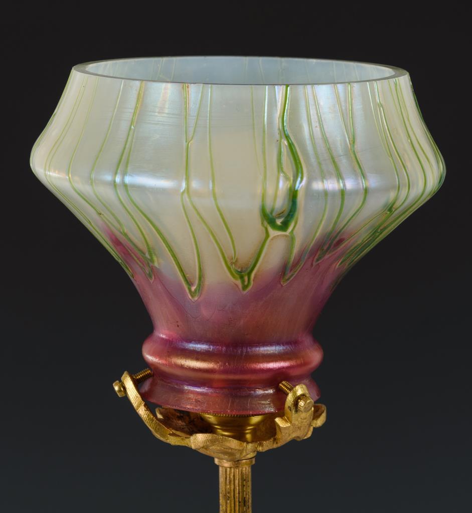 Farbloses, irisiertes Glas mit Opalglasinnenfang, rosafarbenem, verlaufendem Überfang, aufgesponnene grüne Fäden; Metallguss, goldbronziert.H 48,5 cm.