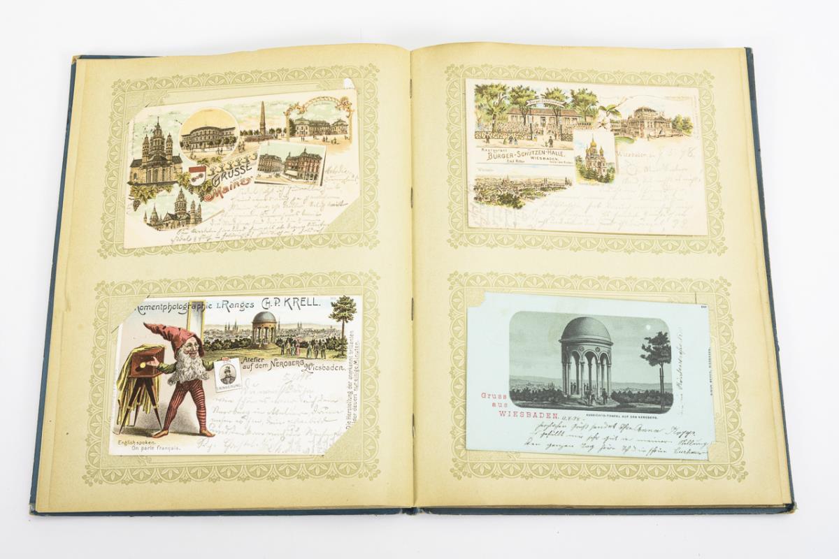 Mostly cards sent to Kathie Willems, Wiesbaden. In blue album with landscape, stained.
