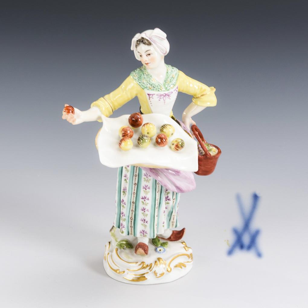 Parisian crier with apples and plum basket. Minimal chip to stand.
