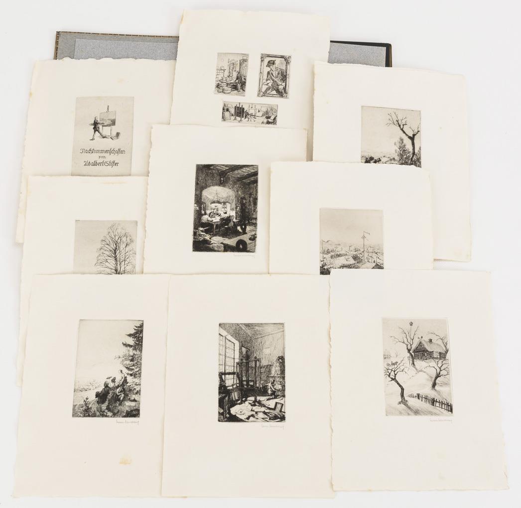 10 etchings in original portfolio with pasted ex libris "Dr. med. Adolf, Georg, Peter Büttner". Partly somewhat foxed and creased.
