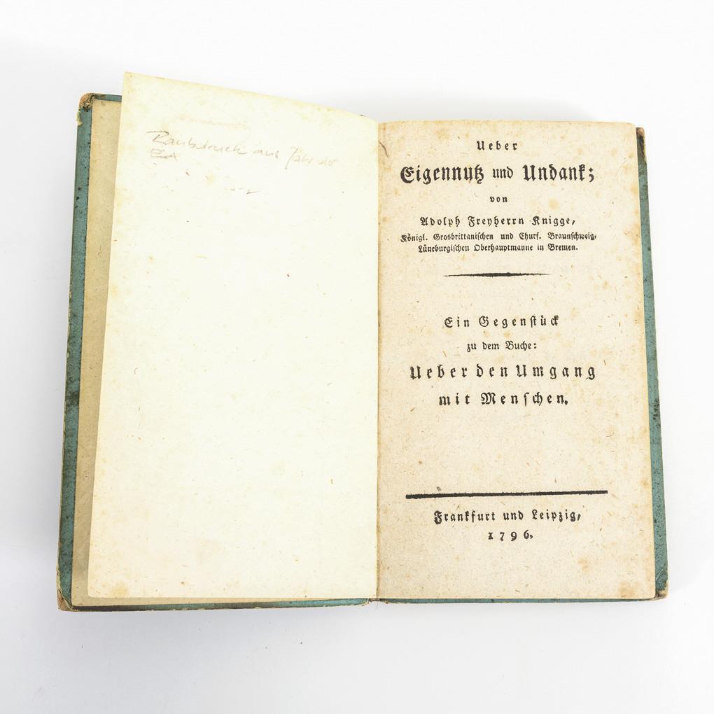 "A counterpart to the book: Ueber den Umgang mit Menschen". Pirated edition from the year of first publication. 284 pages in greenish paperback of the time. Old signs of use, spine darkened.