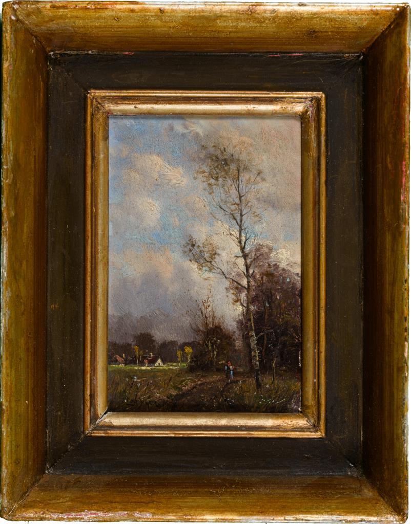 Staffagefigur auf Feldweg nahe dem Wald.