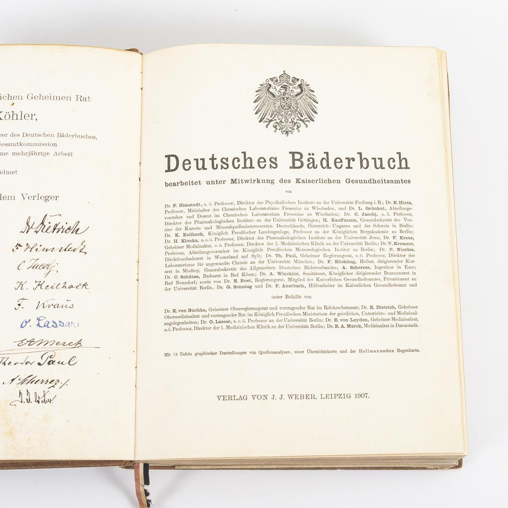 Comprehensive work with chemical analyses of water composition as well as other aspects of healing springs, spas and climatic health resorts. Dedication copy with handwritten signatures of the authors for Dr. Köhler. 104, 535 pages and 2 maps and 7 coloured plates. In embossed leather binding and black and white red ribbon bookmark. Light signs of age.