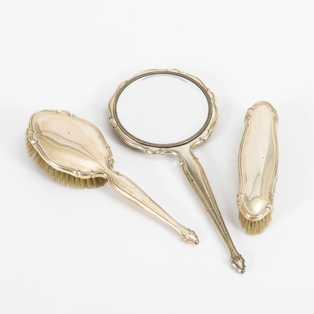 2 brushes and 1 hand mirror with curved profile edge. Signs of use.