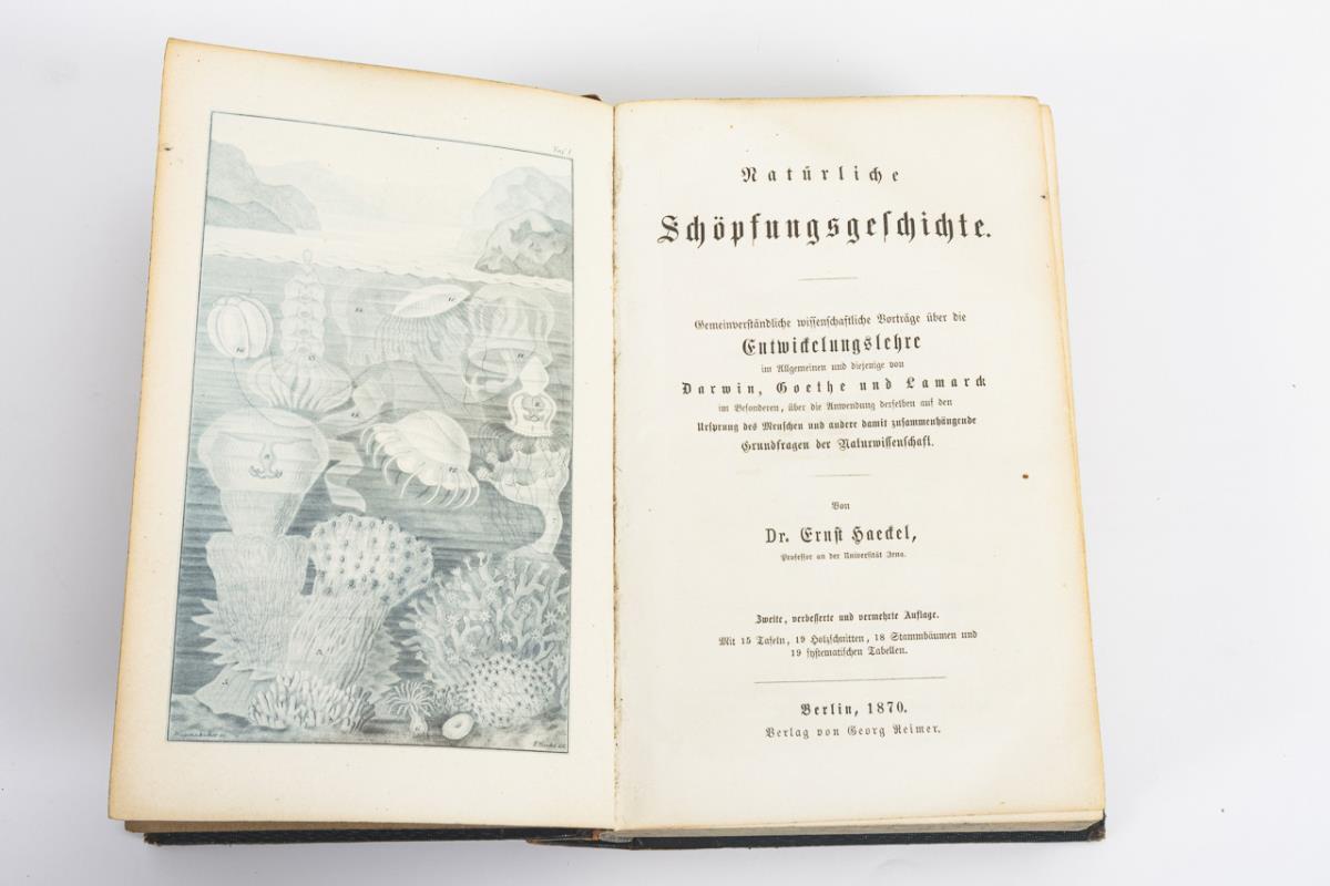"Natural History of Creation - Gemeinverständliche wiss. Lectures on the Doctrine of Evolution in General, and that of Darwin, Goethe, and Lamarck ..." 2nd improved and increased edition, Berlin 1870, 688 pp. Half leather binding, spine defective, 22 x 14 cm. / "Anthropogenie oder Entwicklungsgeschichte des Menschen", 2nd unchanged edition, Leipzig 1874, published by Wilhelm Engelmann. 732 pages, with illustrations. Half leather binding, 23 x 16 cm. / "Gesammelte populäre Vorträge aus dem Gebiet der Entwicklungslehre". Bonn 1878, published by Emil Strauss, 164 pages, with illustrations. Half-leather binding, 24 x 16 cm.