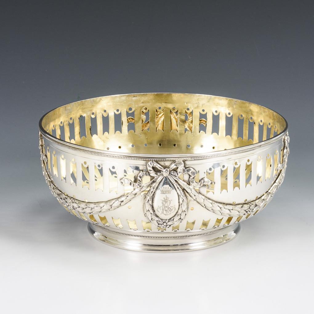 Round bowl in classicist style with bar-shaped pierced wall and partially sculptured festoons. 1x crowned and ligatured monogram engraving "AB". Minimal signs of age and wear, gilding slightly rubbed.