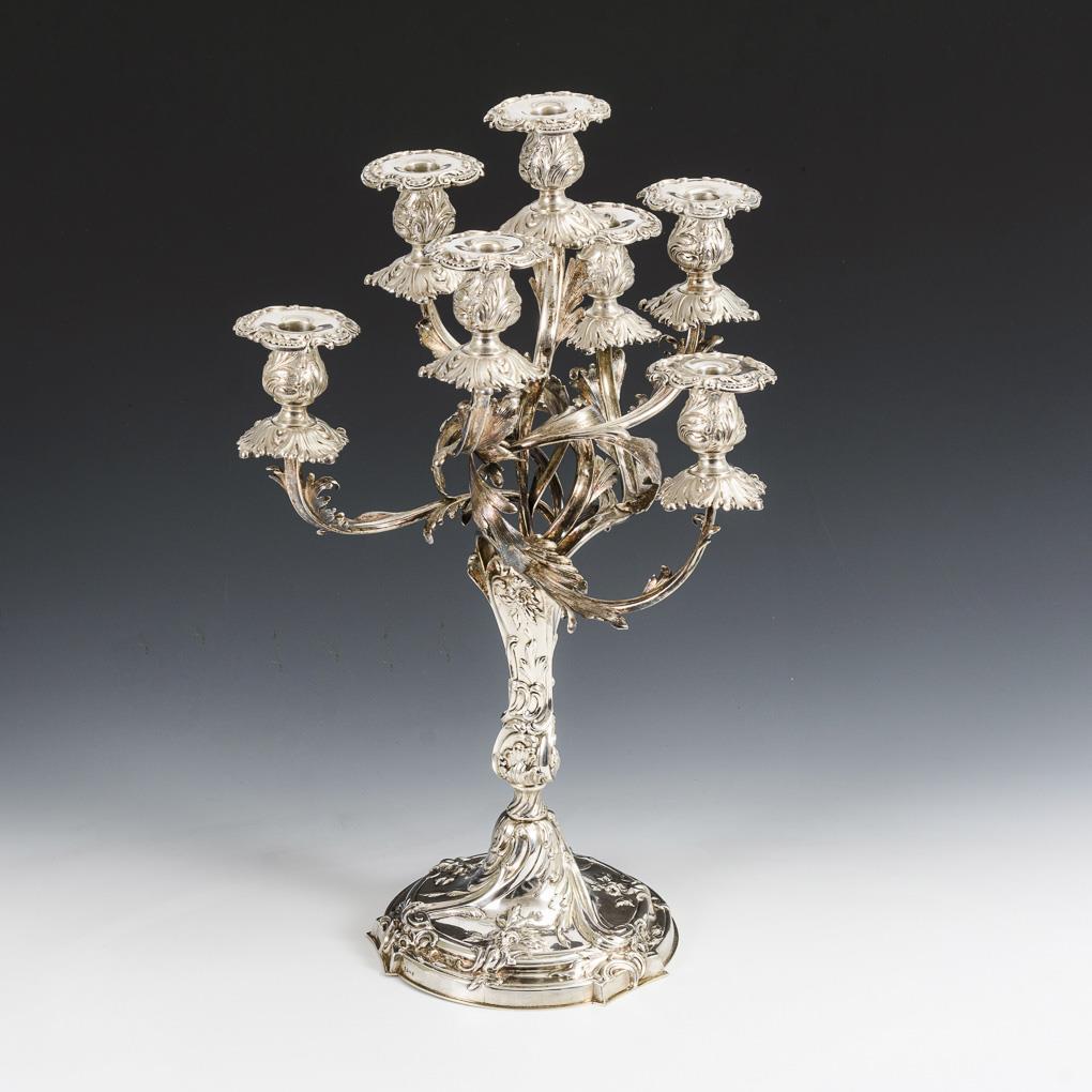 Large 7-burner chandelier with floral relief shaft and round base and sweeping twisted leaf arms with floral grommets, drip plate removable.