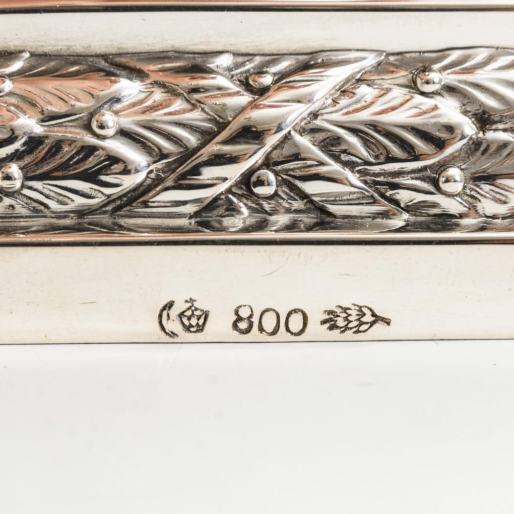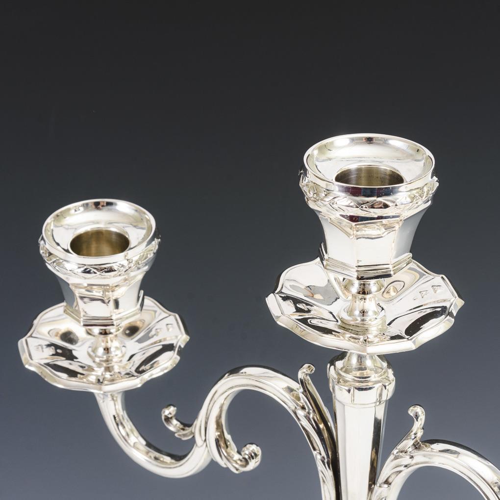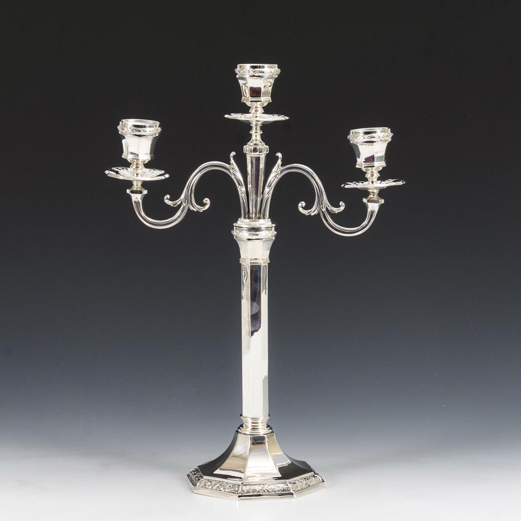 Neoclassical chandelier with faceted stem, 2 curved chandelier arms and 3 spouts with floral drip plates, on octagonal foot. Attachment removable. Minimally dented at the foot.