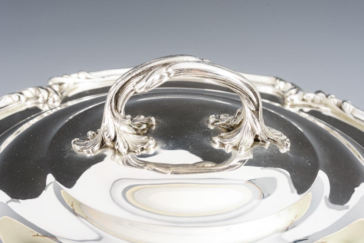 Historicising bowl with curved leaf-relief rim, 2 side handles and lid with bow handle.