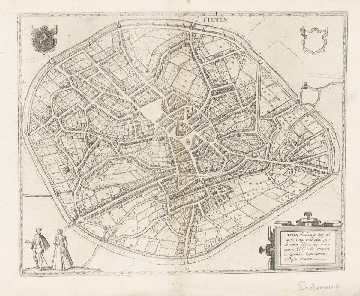 City map of Tienen (French Tirlemont), with scrollwork cartouche and legend, description in Latin on verso; from: "Civitates Orbis Terrarum", 1572 - 1618. Buckling, traces of handling and creasing.
