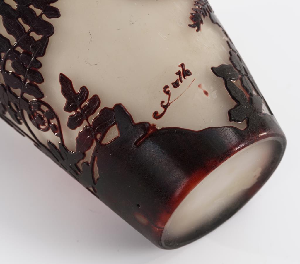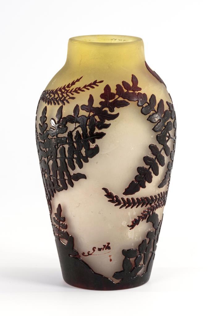 Balustervase, ausgekugelter Abriss. Umlaufende geätzte Farnwedel.