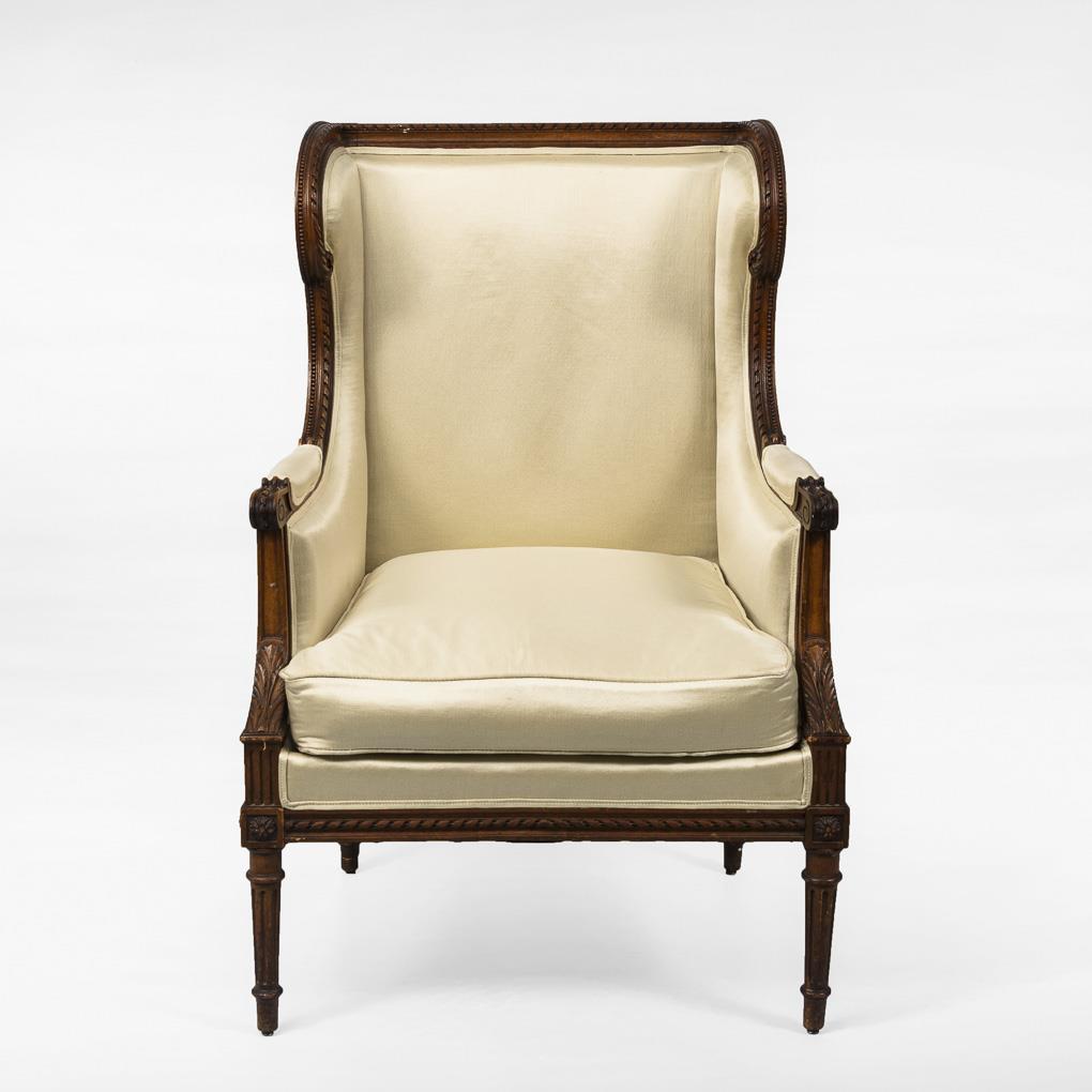 Fully upholstered armchair in typical ear-jaw form with antique carved decoration of fluting, pearl bar and rosettes; champagne-coloured satin cover. Partly anobia attack, signs of age/use, upholstery and cover supplemented, left rear foot with defects.