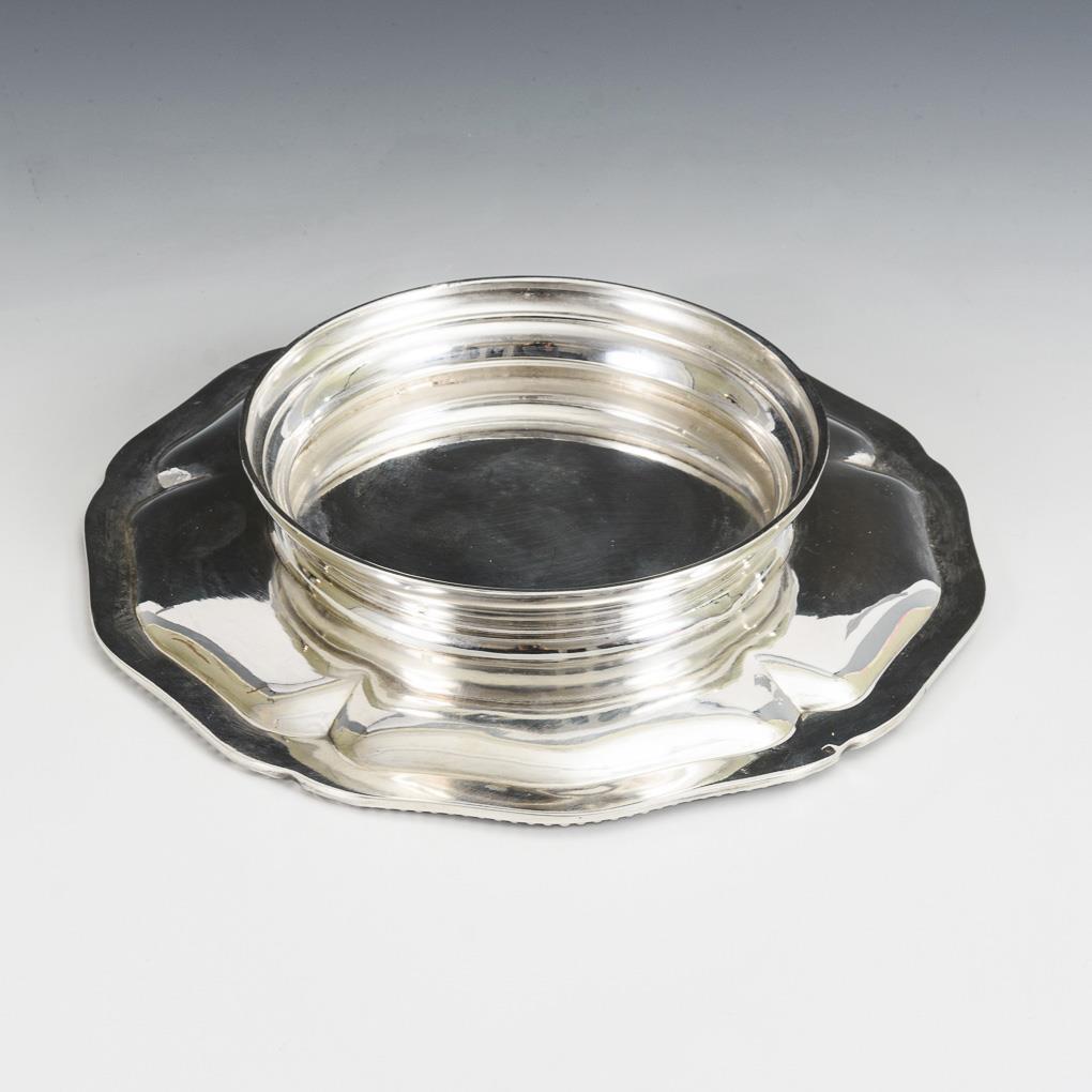 Fitting curved bowl with beaded rim and foliate reliefs, on flat circular foot.