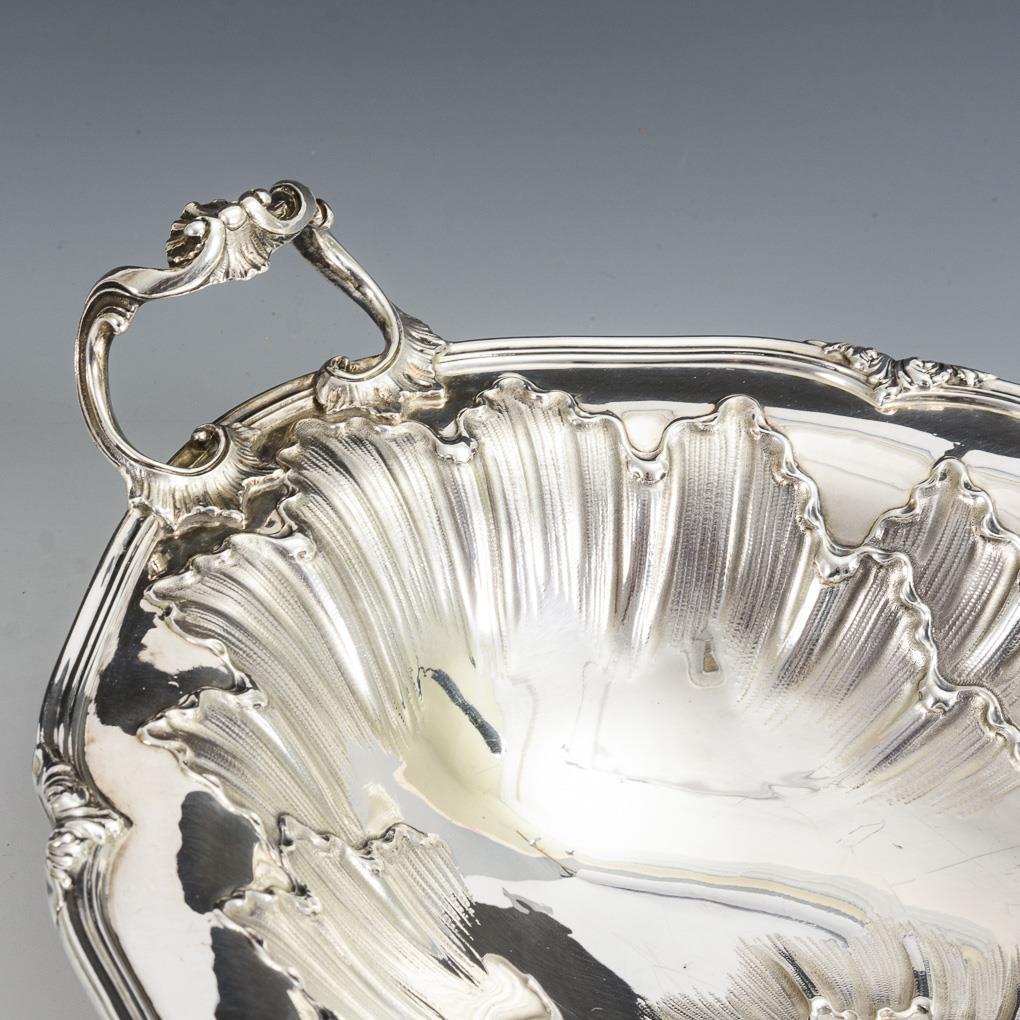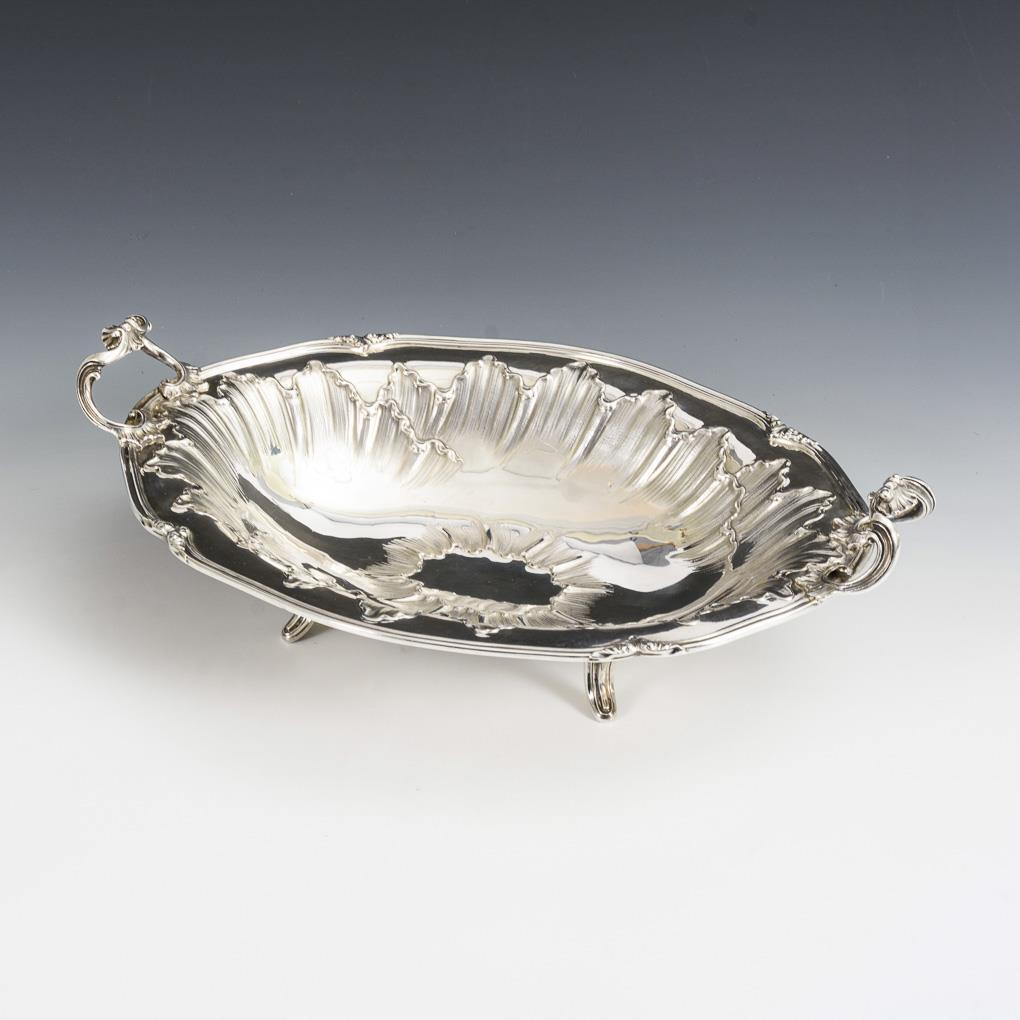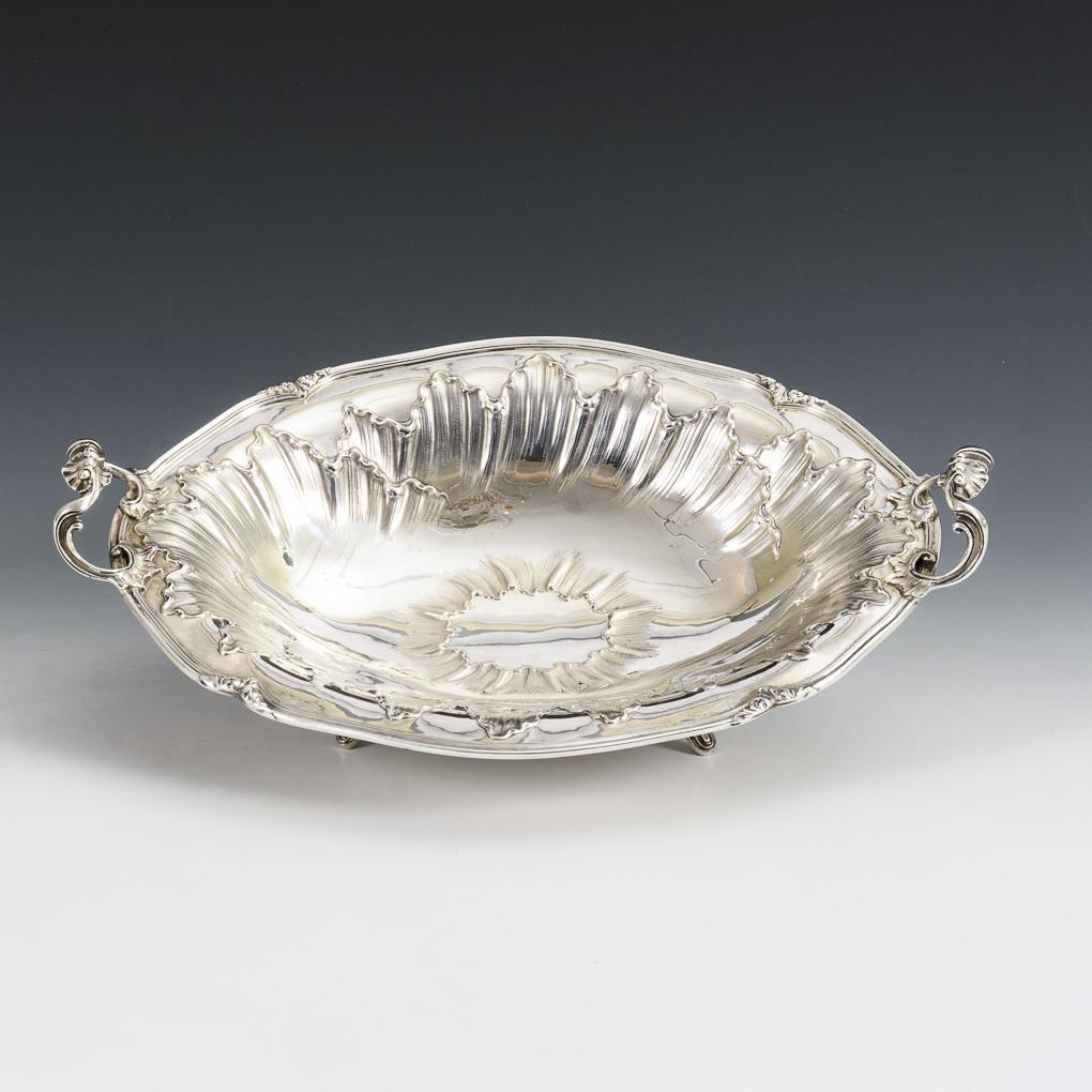 Curved oval bowl with bold floral relief and 2 rocaillé handles, on 4 feet. Minimal signs of wear.