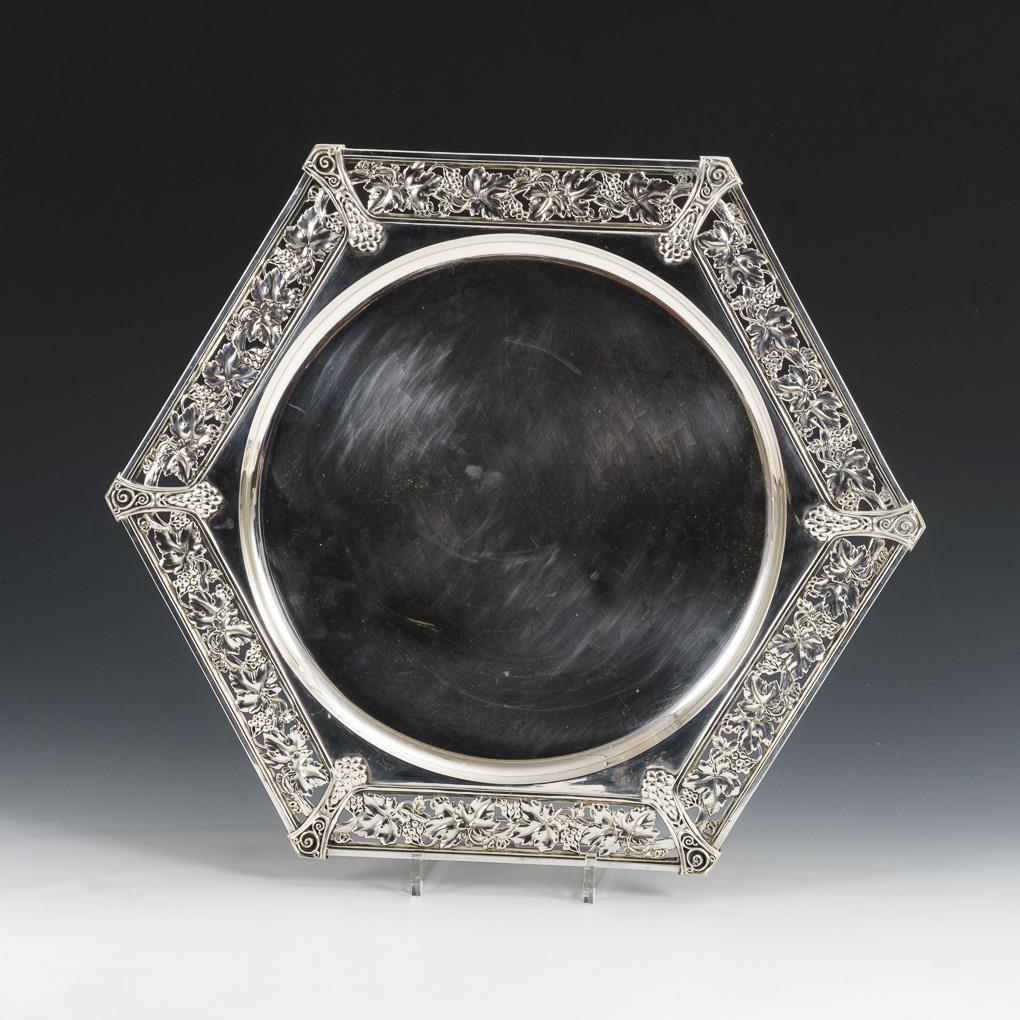 6-cornered tray with openwork relief rim. Round, slightly recessed mirror. Signs of use.
