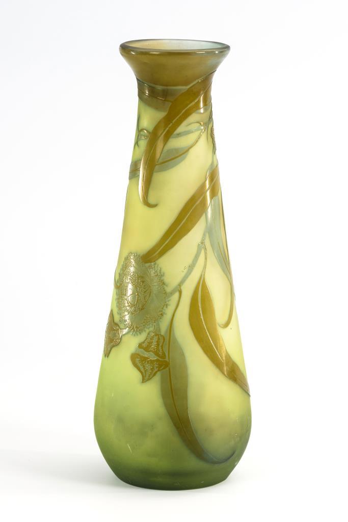 Konische Vase, ausgekugelter Abriss. Umlaufend geätzte Eukalyptuszweige.