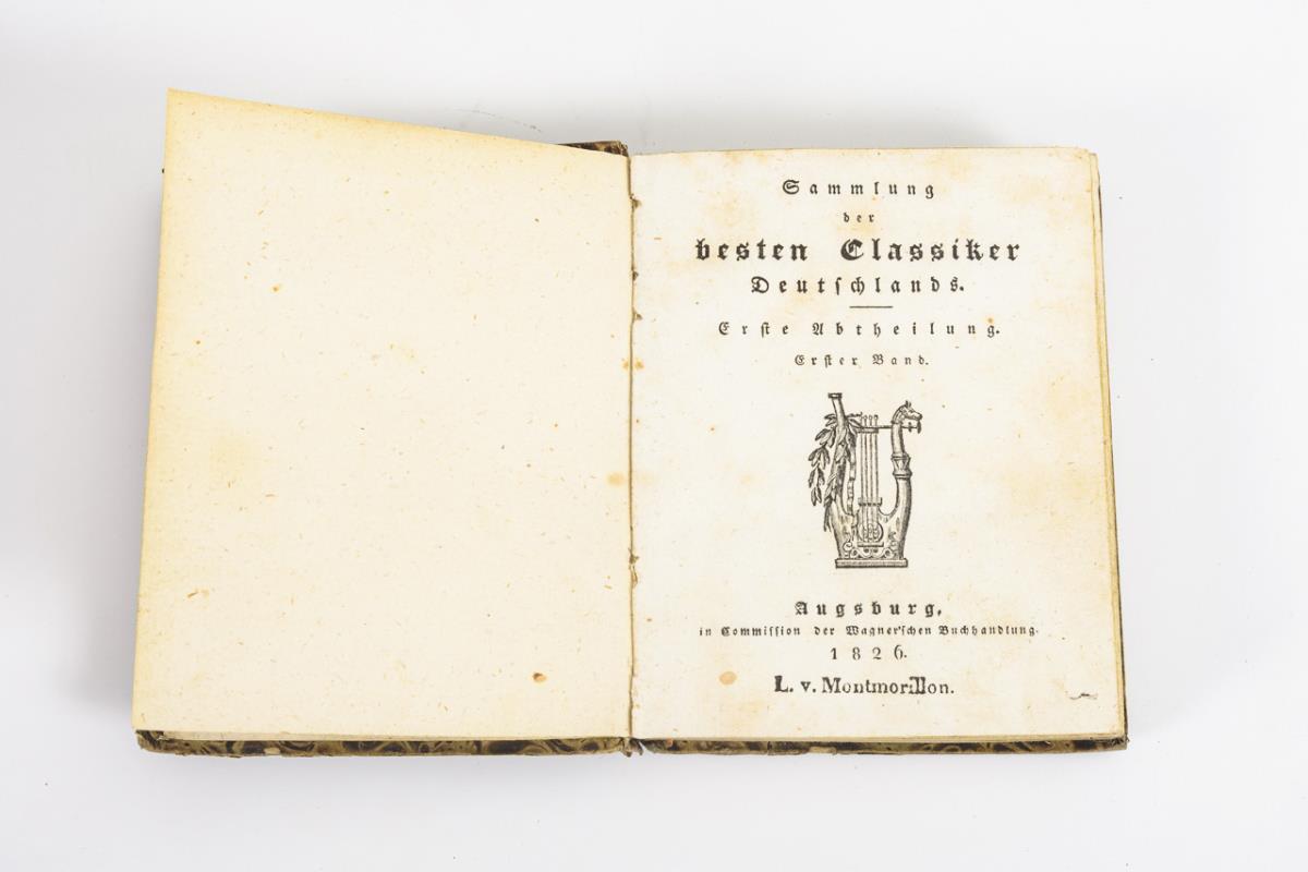 17 of 25 volumes "Sämmtliche Werke", Augsburg 1826 - 1827, in Commission der Wagnerschen Buchhandlung. There are volumes: 1,2,4-10, 12, 17, 19-21, 23-25. In marbled paperback with gold embossing, owner's note. 13,5 x 10 cm. / 3 of 12 volumes "Sämmtliche Werke", Stuttgart and Tübingen 1838, Cottasche Buchhandlung, half leather binding, 15,5 x 11,5 cm. / One volume Schiller: "Lieder". Without title page, half leather binding,15,5 x 11,5 cm. Old condition with traces of use.