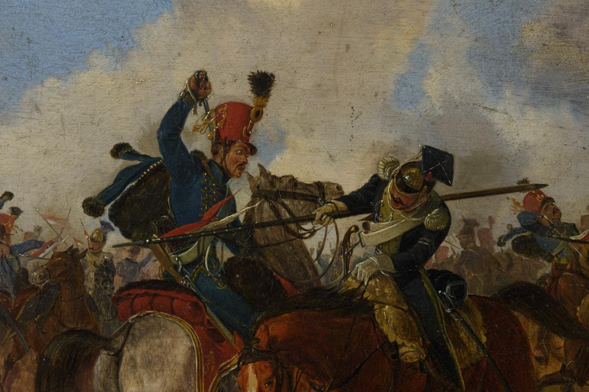 Horsemen in heated combat on wide field under cloudy sky. Verso old adhesive note with inscription by R. Wiegmann "Surrounding picture (...) by Dietrich Monten in Munich was purchased by the Hanoverian Art Society at 12 Louis d'or, I won with my share No. 871 at the exhibition in 1835 (...)". Slight traces of age.