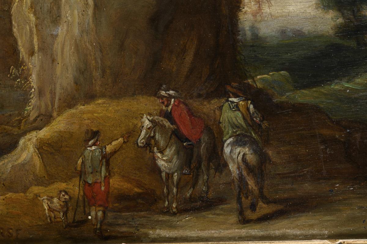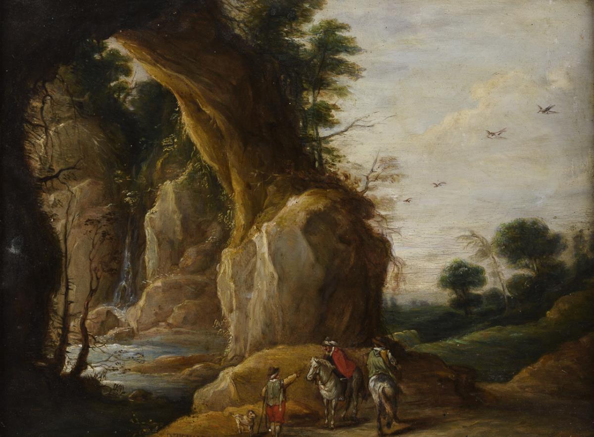 Horseman talking with hiker at a rock arch with waterfall. Paint chipping.