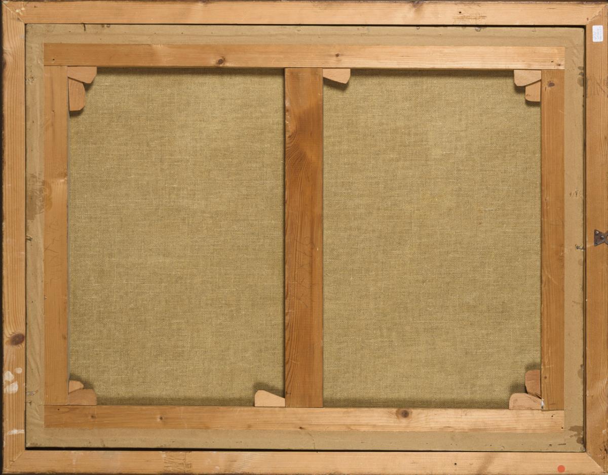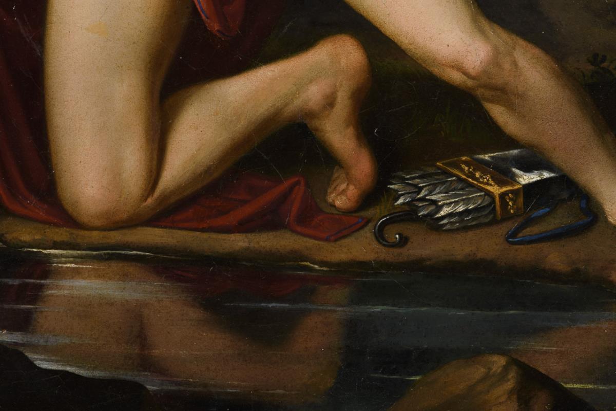 Classicistic representation of the scene from Ovid's Metamorphoses with the half-naked youth kneeling at the water who falls in love with his own reflection. Above him Cupid shooting him with an arrow, further back Echo. canvas doubled spurned by Narcissus before.