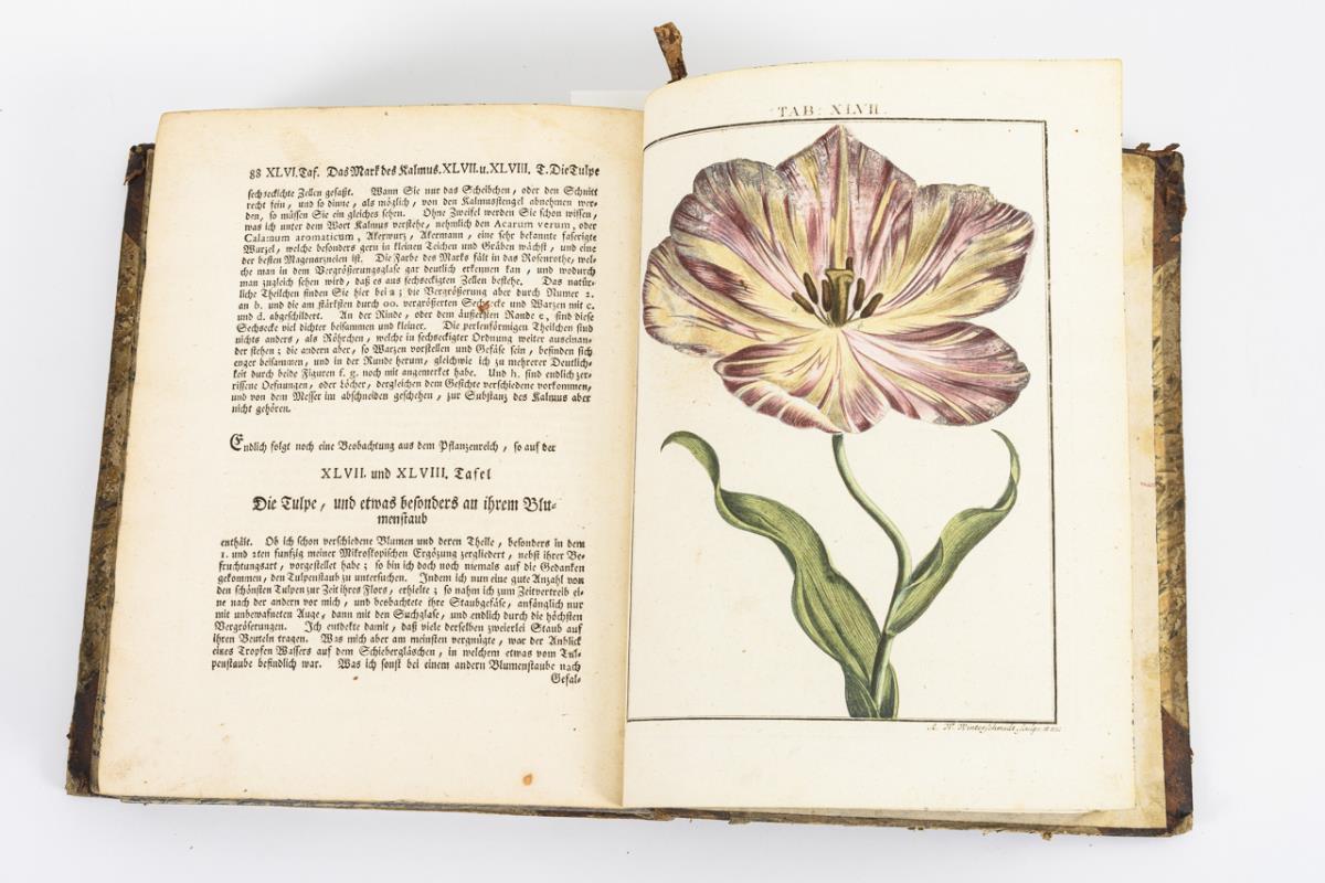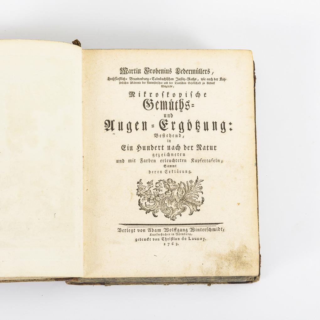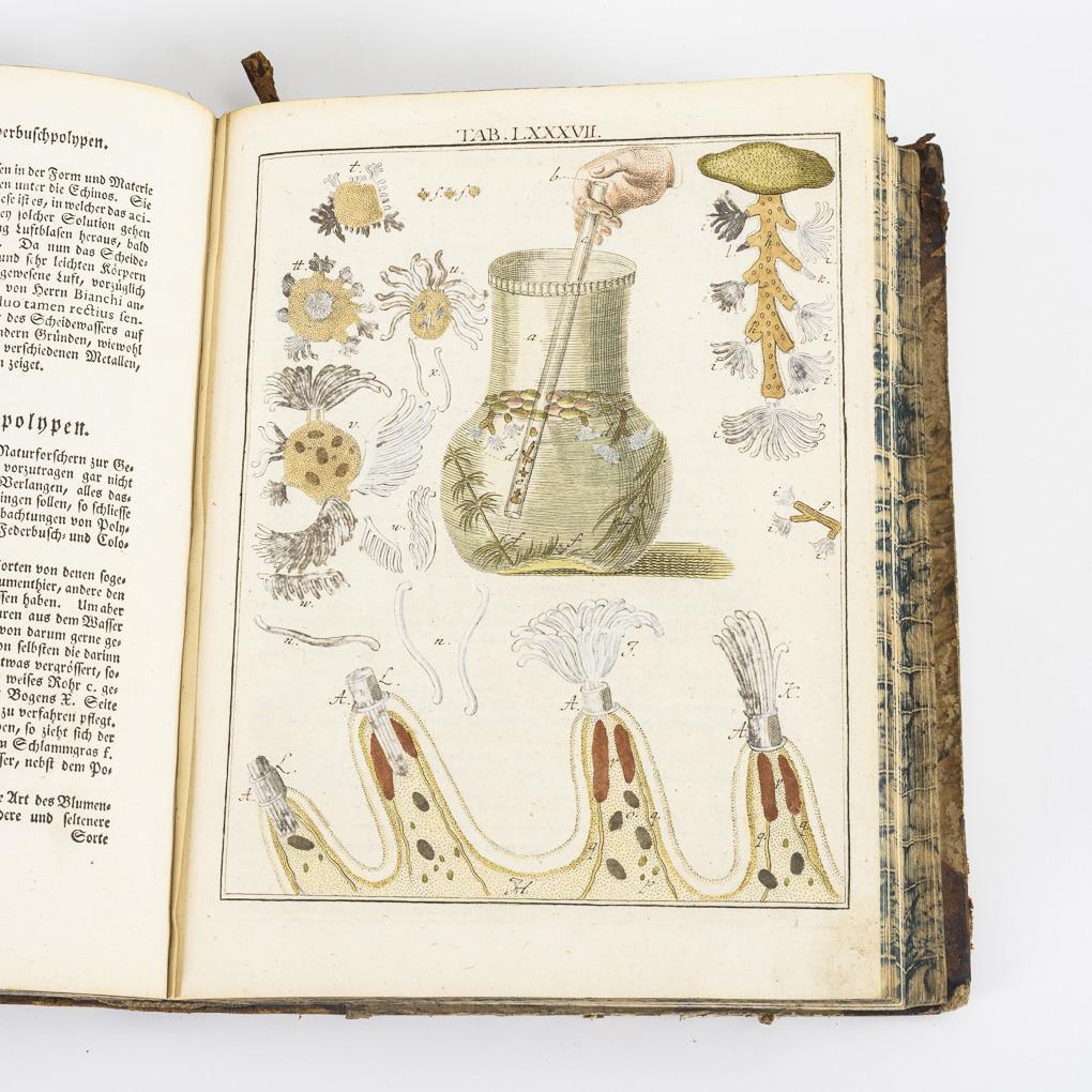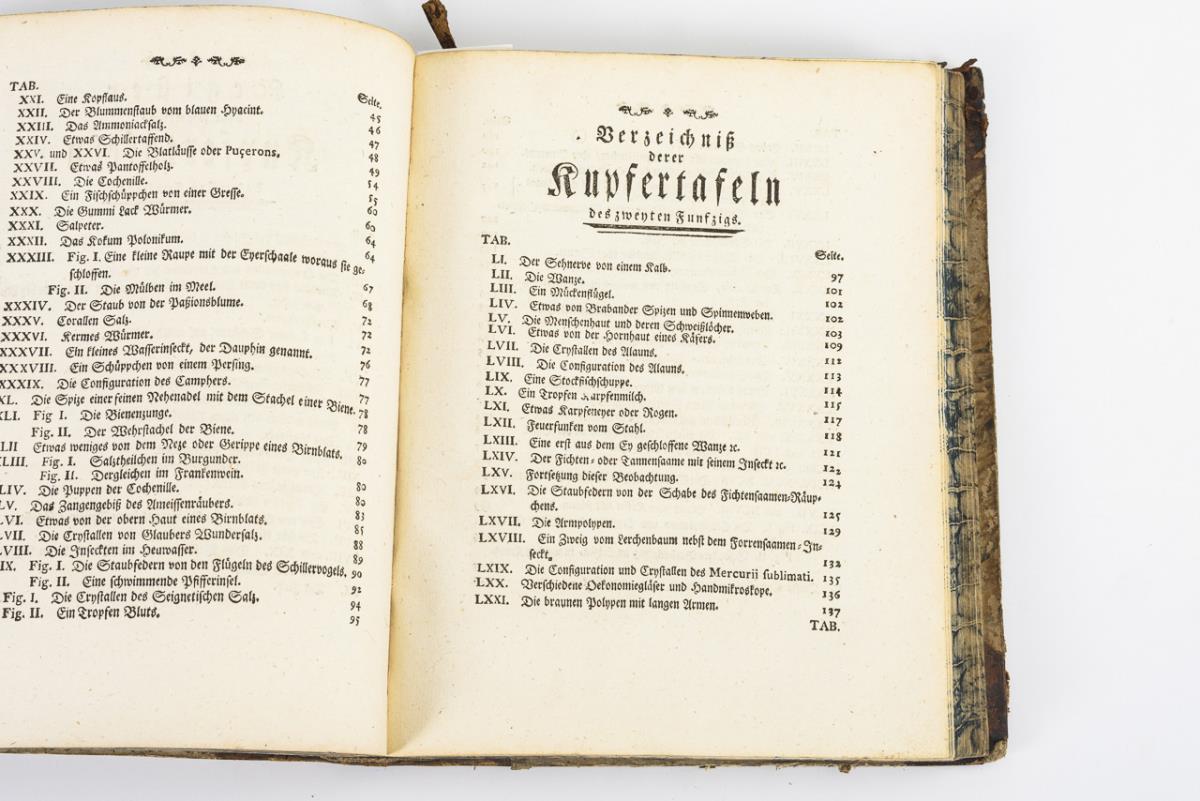 2 copper engravings, one of which coloured, title-page, (10), 204, (4), (Drittes Fünfzig ... in zweyter Auflage), (12), 94, (2) pages and 150 full-page coloured illustrations of a wide variety of animal and plant parts, but also cloth or depicting microscope techniques. Leather binding and marbled edges. Old good condition, block nice and fresh, with a few traces of use on the initial pages.