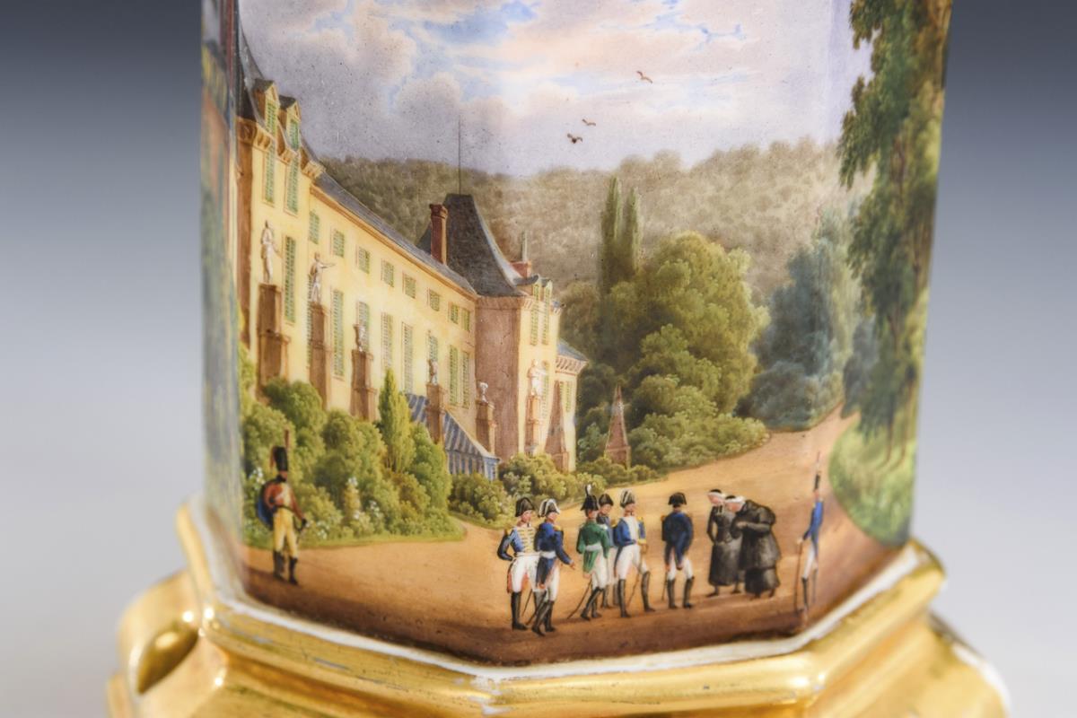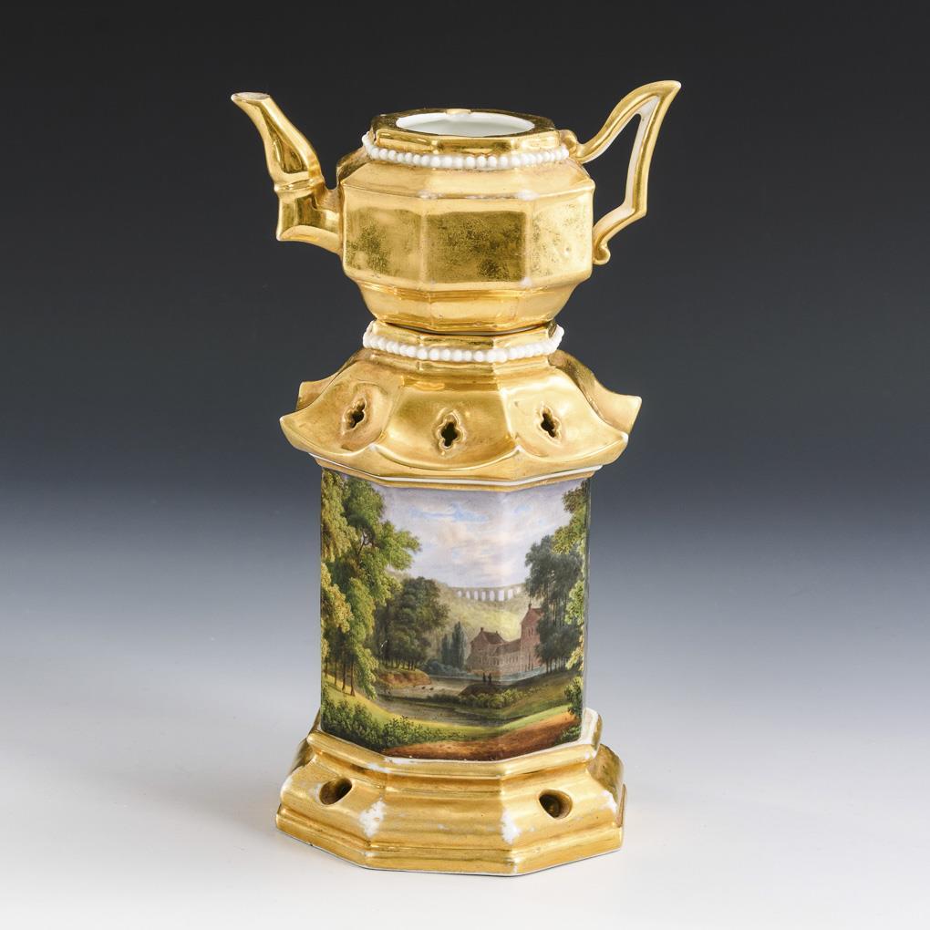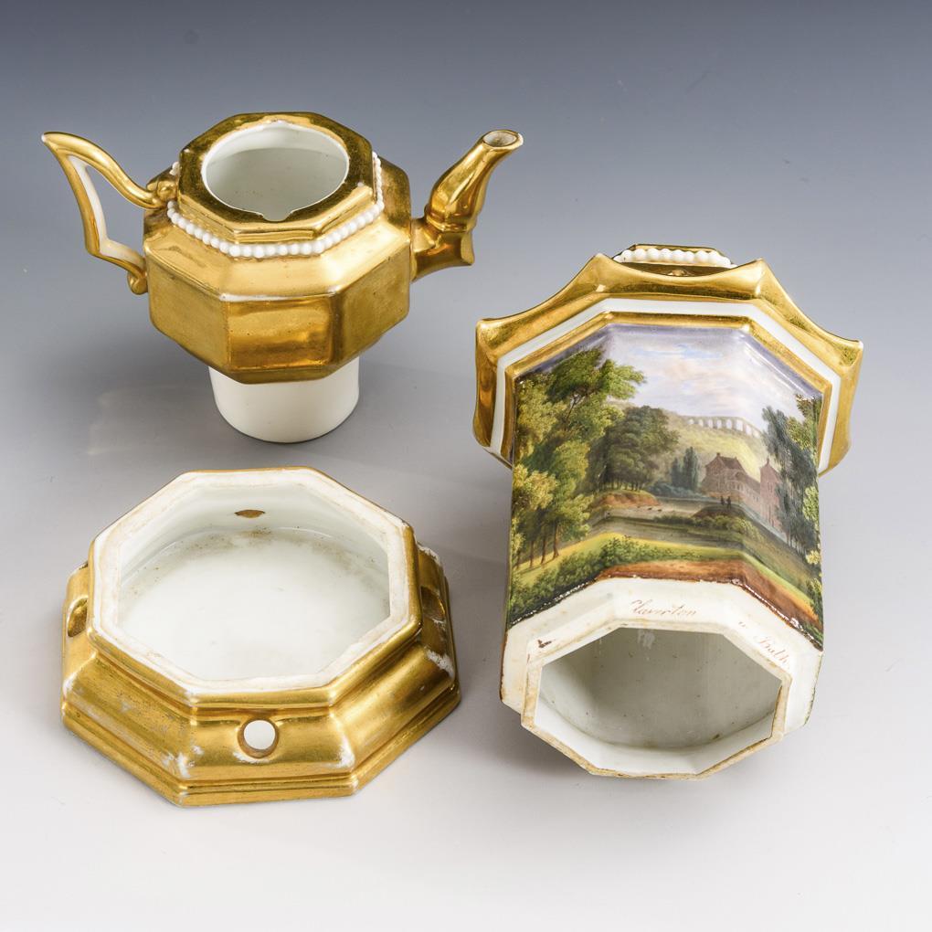 3 pieces. Octagonal form. Jug with gold background and pearl band. Pagoda shaped teapot with inscribed views (Malmaison Castle, Haverton). Pot without lid, minimal gold wear in places.
