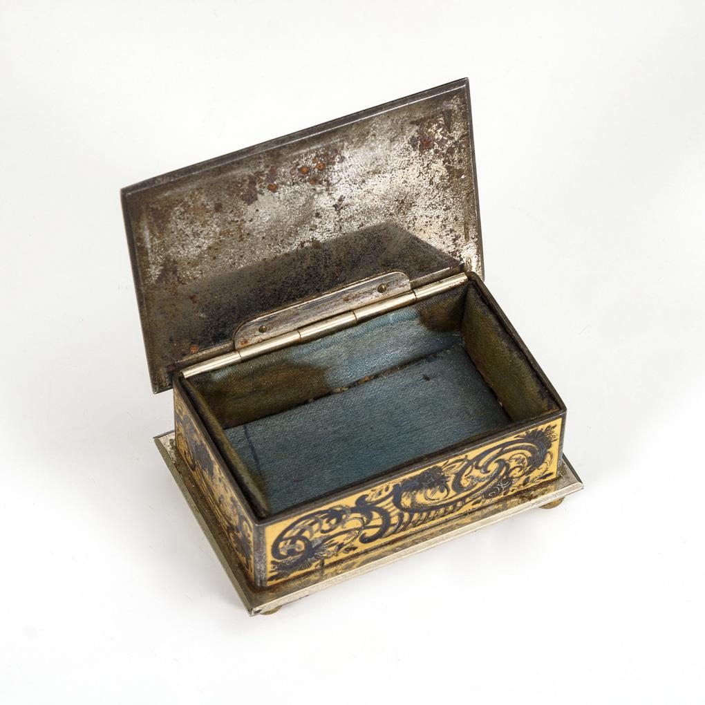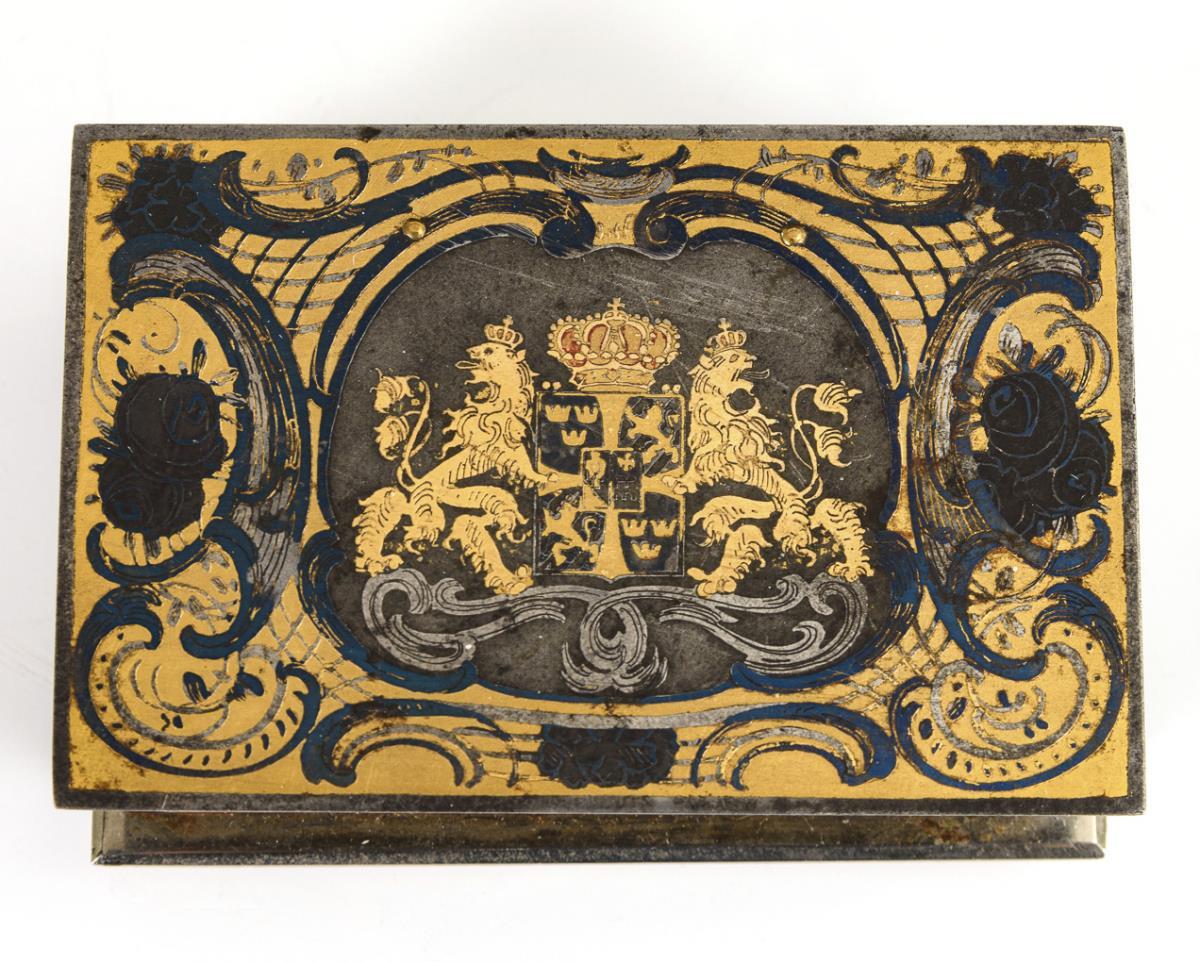 Ornamented on all sides and on the lid with rocailles over gold ground; on the hinged lid in the cartouche the coat of arms. Inside originally blue velvet. Some signs of age/use.