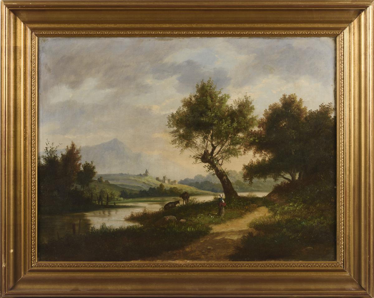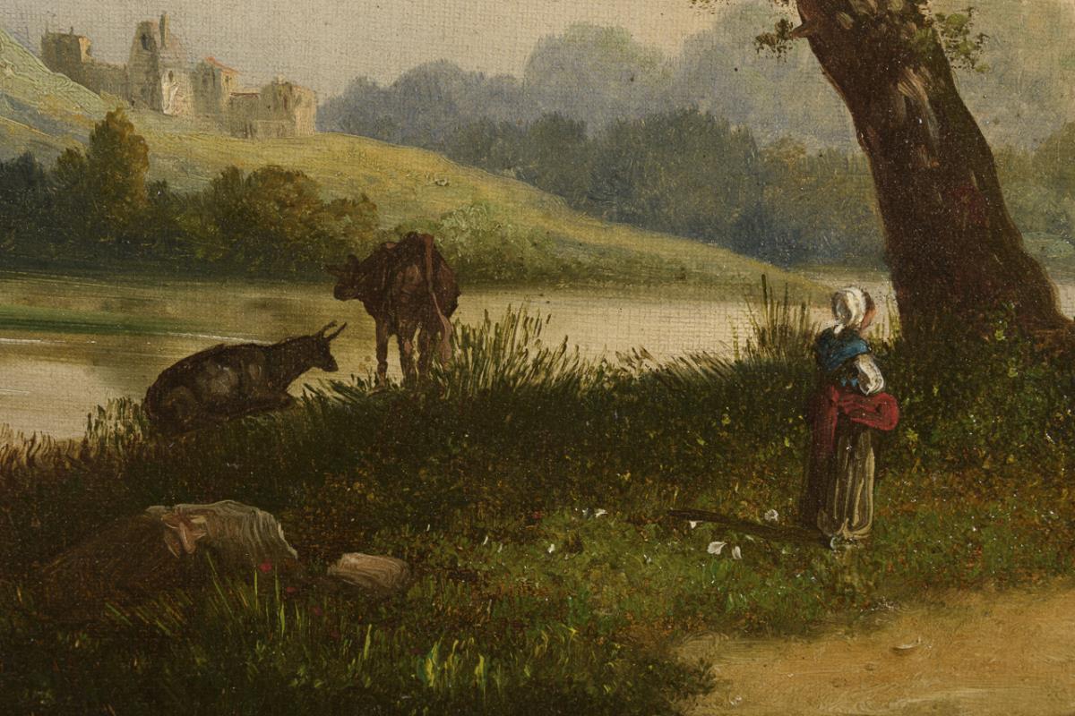 maid and cattle on a meadow at the river bank with view to the town further back in front of the mountains. canvas doubled.