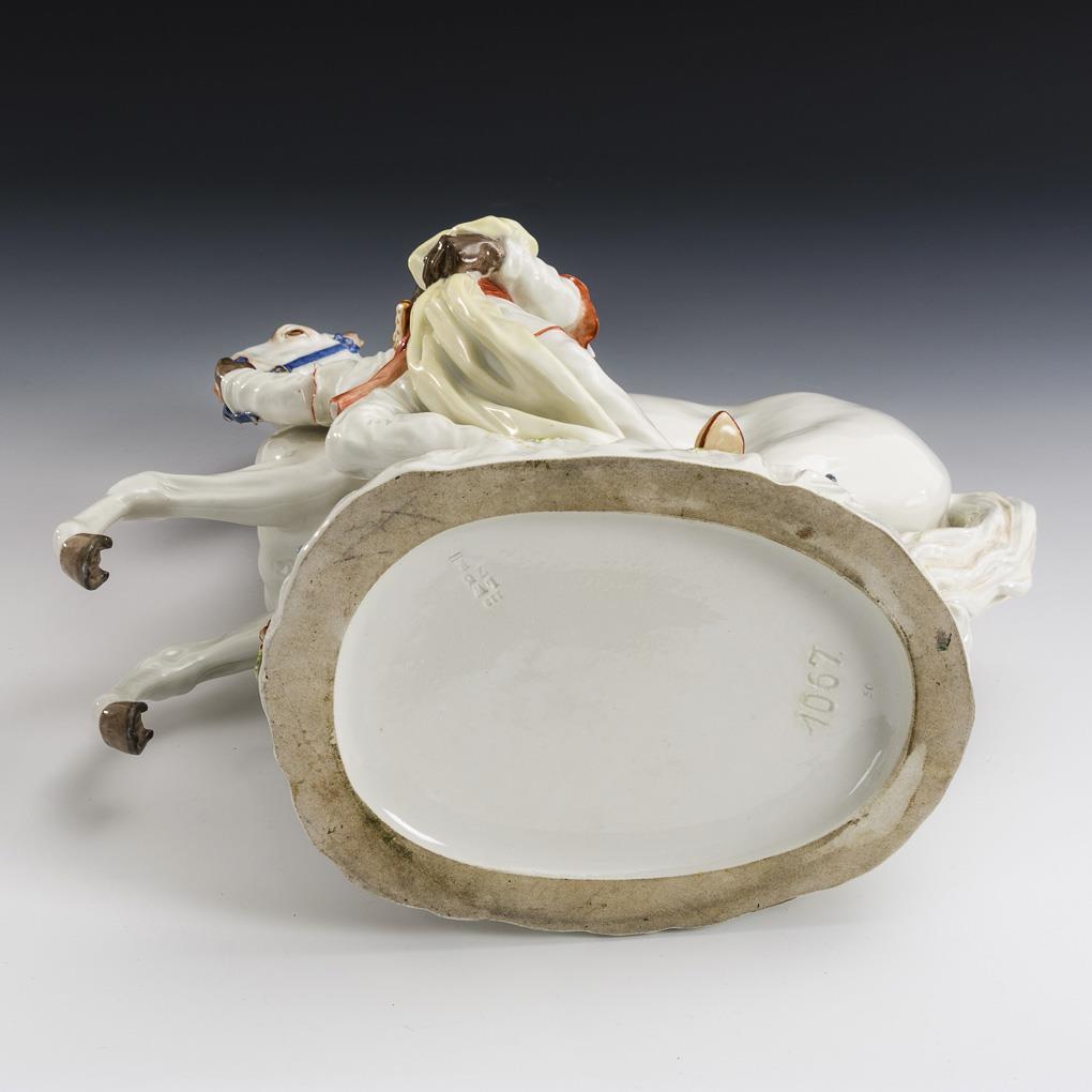On a flower-covered pedestal standing, orientally dressed African, leading a horse performing the lesson of the levade at the reins. Reins defective, 3 leaves bumped.