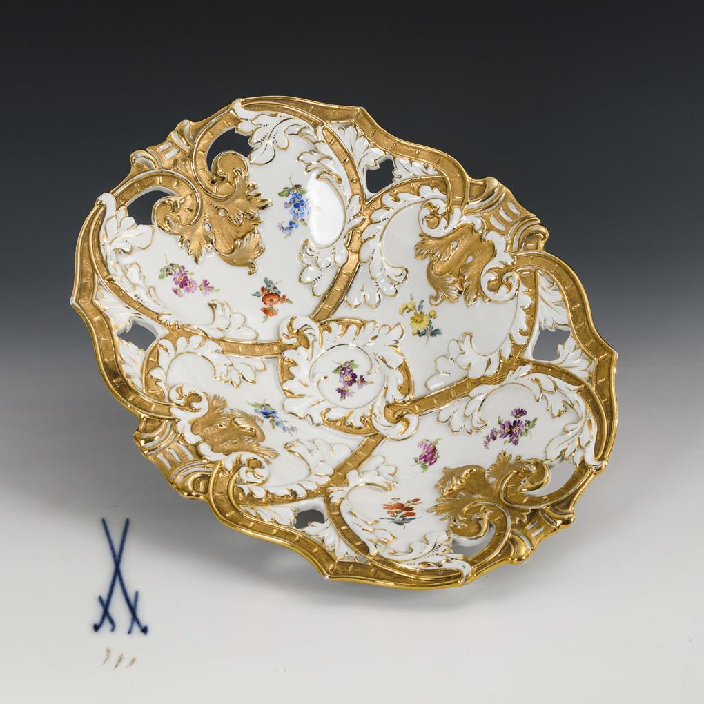 Oval bowl with rocaille aperture and foliate relief. Minimal gold rubbing.