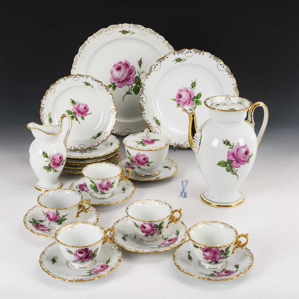 21 pieces. Biedermeier form with rocaillerelie rim. Coffee pot (h 14,5 cm), milk jug, 5 cups, 6 saucers, 6 cake plates and 2 credenza plates (Ø 26 and 30,5 cm).