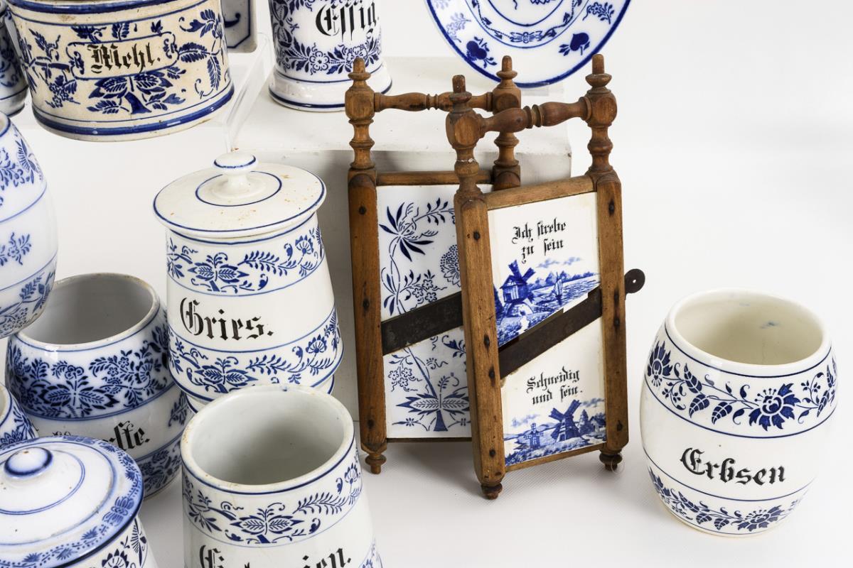 Approx. 26 pieces. 12 storage jars, 4 spice jars, 1 wall mest, 1 bottle, 3 assorted boards (L 18.5 to 29 cm), 1 plate, 2 slicers and 1 hooked rail. Some lids missing, some with defects and restorations.