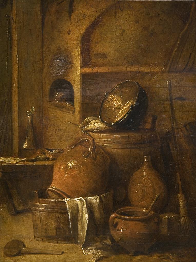 Quality and compositionally powerful kitchen still life. The simple objects, whose arrangement seems somewhat haphazard and random, are artfully arranged. Parquetry. Gilt stucco frame with blackened moulding.