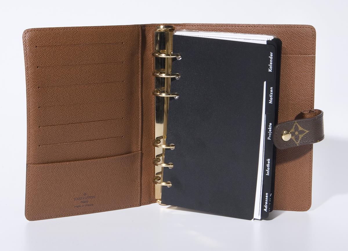 Paris, Made in France. Model: R 20004. classic LV monogram canvas. Leather interior, snap closure. Ring binder with 6 hole punching, 6 credit card slots, 2 partial pockets. Filofax inserts: calendar, notes, projects, info desk, addresses, alphabet, 9 business card inserts for 3 cards each.