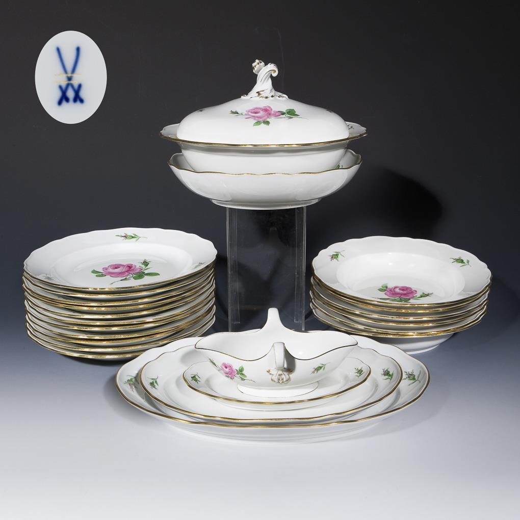 Form "New Cutout", colour painted, gold painted, decor "Red Rose". 1 lidded bowl, 1 round bowl, 2 oval dinner plates, 1 sauce boat, 11 dinner plates, 6 soup plates. Painter's marks, press marks, sword marks painted twice. One stand ring minimally bumped.