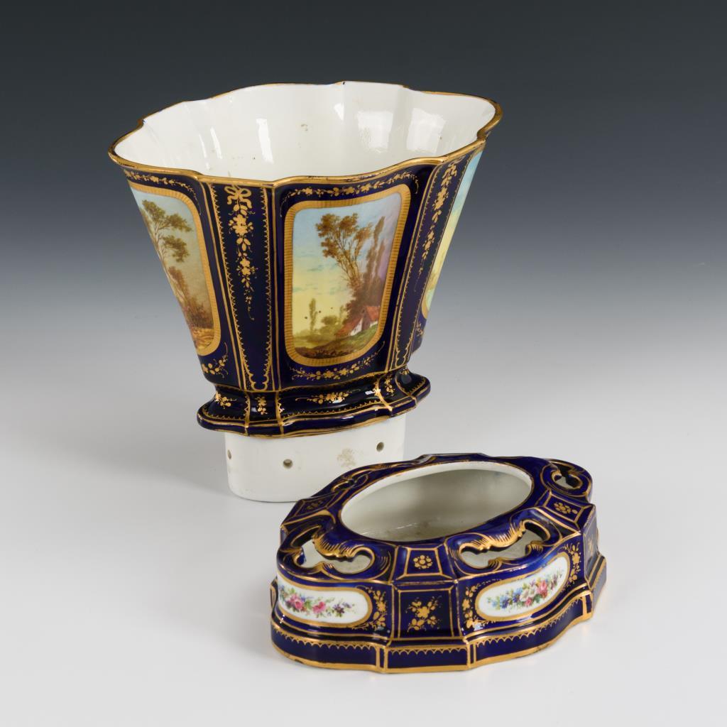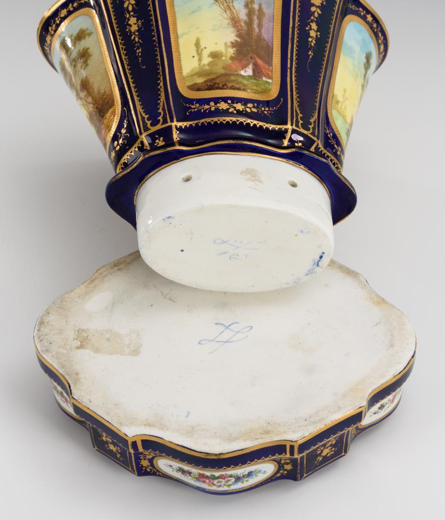 Konisch-vierpassige Vase, eingesteckt in einen Blumenstecksockel. Allseitig Kartuschen mit Landschafts- bzw. Blumenmalerei, schauseitig eine galante Szene. Partiell minimaler Goldabrieb.