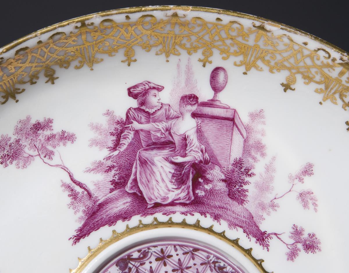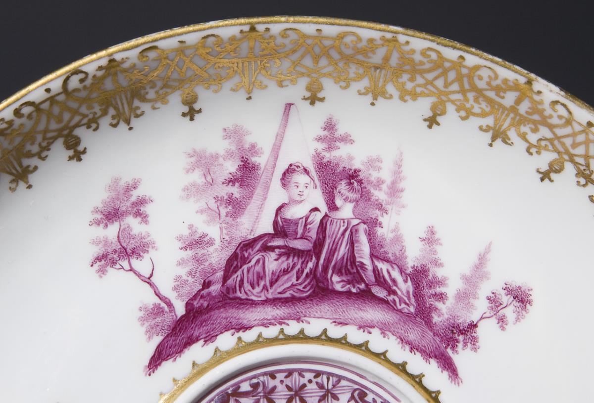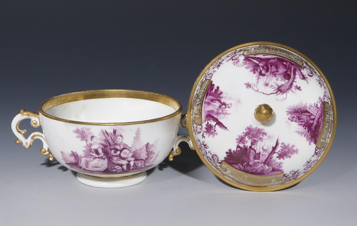 All over rich fine camaieu painting in purple with nine different scenes after Jean Antoine Watteau (1684-1721). Purple mosaic in the mirror. Gold lace borders, gold staffage. The four scenes on the lid are painted on fine gold lace consoles connected by purple tendrils. Sword marks, gold painter's marks. handle restored.